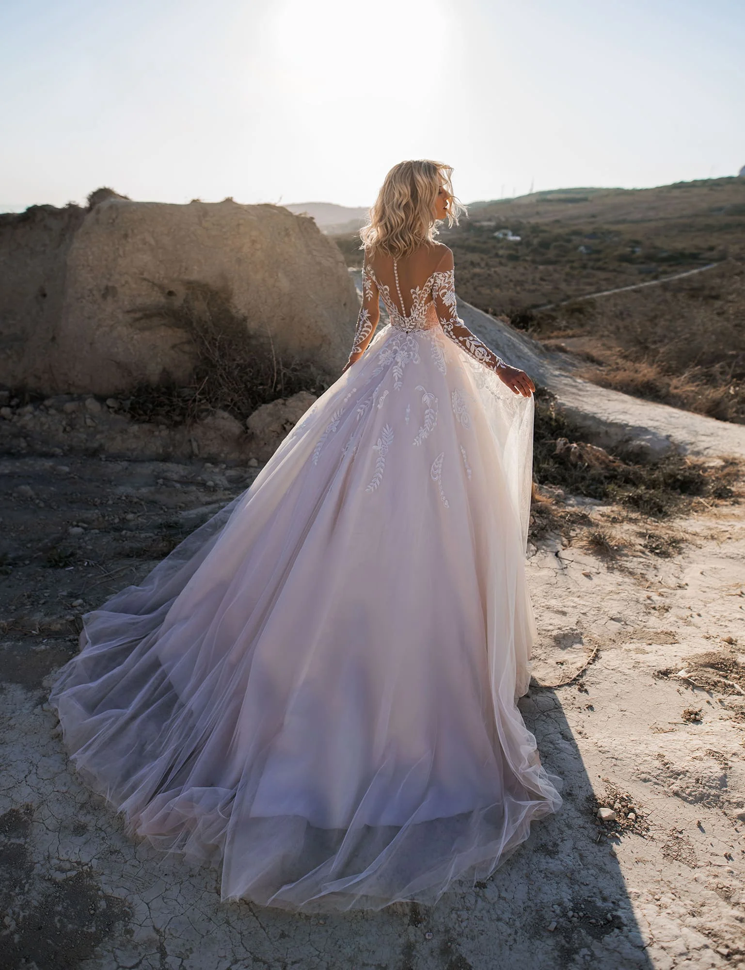 Тюлевые Свадебные платья с длинным рукавом 2021, свадебное платье принцессы с V-образным вырезом, кружевное свадебное платье с аппликацией, женское платье
