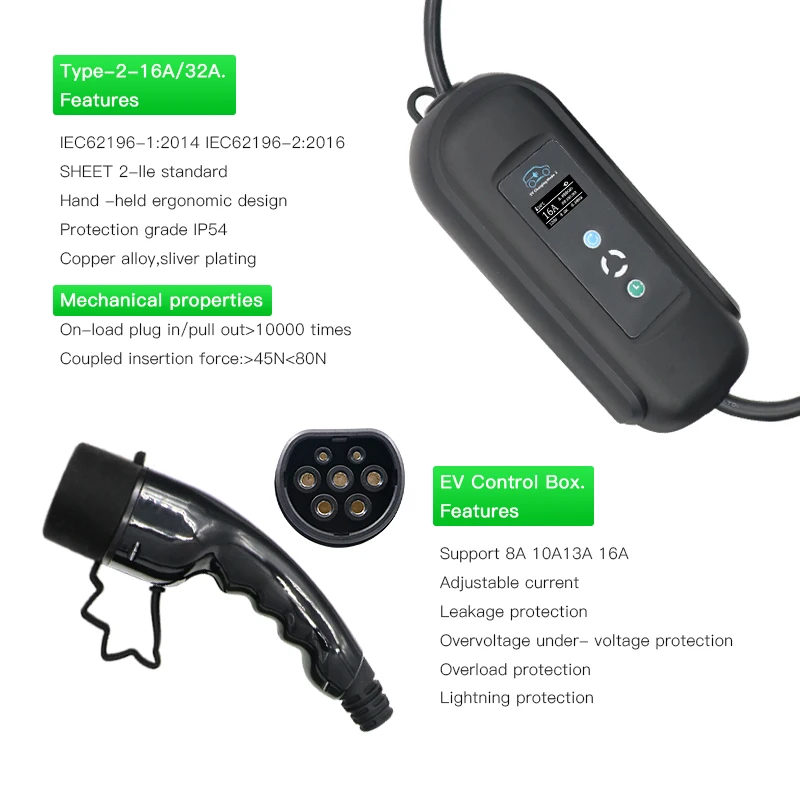 Разъем: IEC62196 Тип 2• Степень защиты: IP54 (рабочее состояние)• Контактный Буш: медный сплав, серебро + Термопластик сверху• Входная мощность: 110-250 В переменного тока• Ток: 8A 10A 13A 16A регулируемый• Общая длина: 5 метров• Воздействие внешней силы: может позволить себе падение 1 м и 2t транспортное средство работает над давлением• Огнестойкость корпуса: UL94V-0. Сделать зарядку проще и безопаснее!(Огнестойкий класс пластика постепенно увеличивается от HB, V-2, V-1 до V-0.UL94V-0: после двух испытаний на сжигание на образце 10 с пламя потушилось в течение 10 секунд. Не имеет падающих ожогов.)