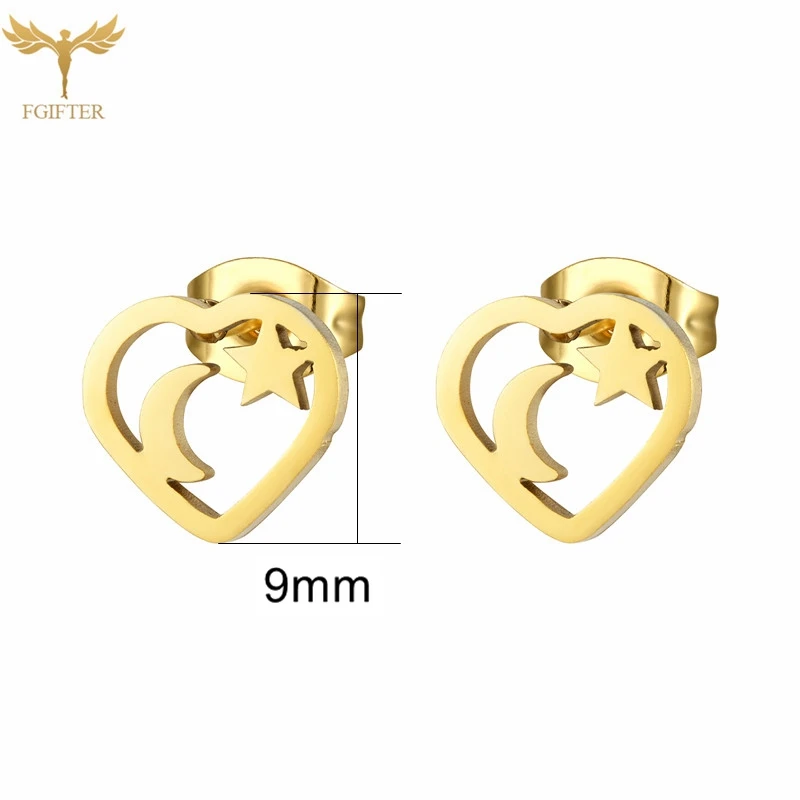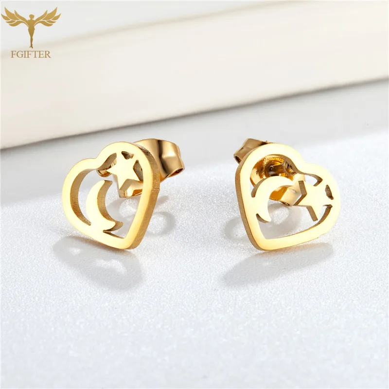 Золотые серьги для женщин, серьги-гвоздики в форме сердца, содержит звезду, луну, серьги для девочек, подарок на день рождения
