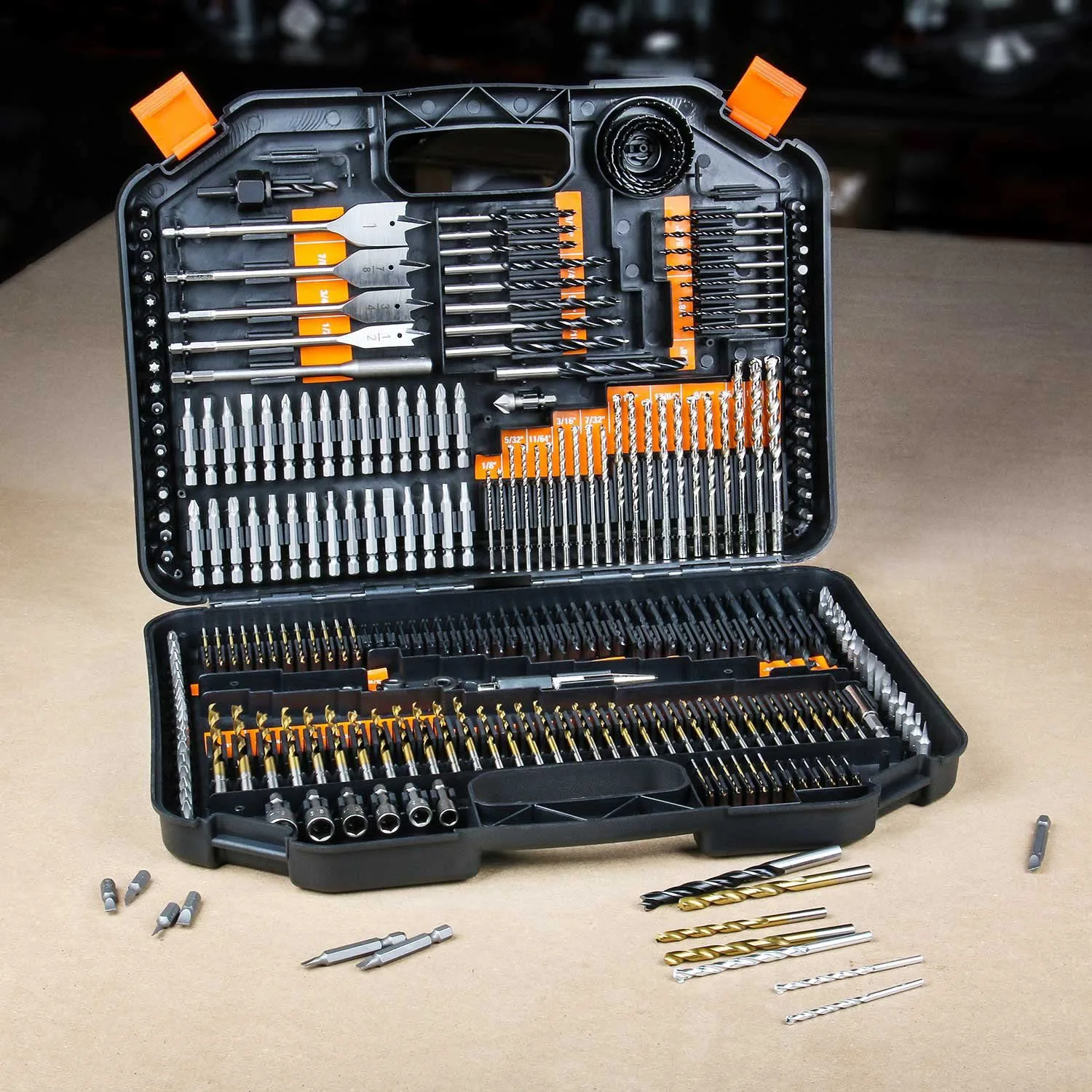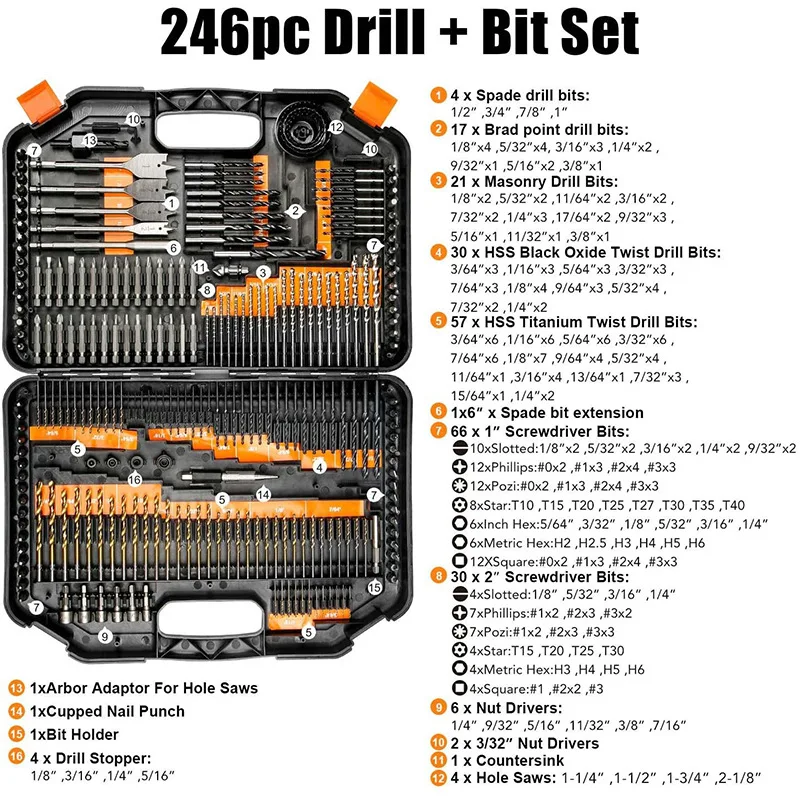 Особенности:-6 дюймовых шестигранников, 6 метрических шестигранников, 12 квадратных-30 шт. 50 мм отвертка: - 4 шт. прорези, 7 шт. Phillips,7 шт. Pozi,4 шт. Torx,4 шт. квадрат, 4 шт. метрический Шестигранник, 1 шт. наконечник для ногтей, 58 мм магнитный держатель бит, прочный пластиковый чехол для хранения 246 шт. набор сверл включает в себя:-57 шт. титановые сверла HSS: 6x1,0, 1,5, 2,0, 2,5, 3,2 мм, 7x3,0 мм, 4x3,5, 4,0, 5,0 мм, 1x4,5, 4,8 мм, 2x5,5, 6,0, 6,5 мм.-30pcs HSS стиральная машина с черным оксидом твист-сверло: 3x1, 1,5, 2,0, 2,5, 3,2, 3,5 мм, 4x3,0, 4 мм, 2x5,5, 6,5 мм.-17 шт. сверла для дерева: 4x3,0, 4,0 мм, 3x5,0 мм, 2x6,0, 8,0 мм, 1x7,0, 10 мм.-4 шт. плоские деревянные сверла: 13, 16, 19, 22 мм. 21 шт. сверла для кладки: 2x3,0, 4,0, 4,5, 5,0, 5,5, 6,5 мм, 3x6,0 мм, 3x7 мм, 1x8,0, 9,0, 10 мм-66 шт 25 мм отвертка биты:-10 шт. прорези: 2x3,0, 4,0, 5,0, 6,0, 7,0 мм.-12 шт. Phillips: 2 x PH0, 4 x PH2, 3 x PH3. 3 x PH1.-12 шт. Pozi: 2 x PZ0, 4 xPZ2, 3 x PZ3, 3 x PZ1.-10 шт. шестигранные: H2, H2.5, H3, H3.5, H4, H4.5, H5, H5.5, H6, H7.-8 шт. Torx: T10, T15, T20, T25, T27, T30, T35, T40, T45.-6 дюймовых шестигранников: 5/64 ", 3/32", 1/8 ", 5/32", 3/16 ", 1/4".-6 метрических шестигранников: H2, H2.5, H3, H4, H5, h6.-12 шт. квадрат: 2 x S0, 3 x S1, 4 x S2, 3 x S3-30 шт. 50 мм отвертка биты:-4 шт. прорези: 3,0, 4,0, 5,0, 6,0 мм.-7 шт. Phillips: 2 x PH1, 3 x PH2, 2 x PH3.-7 шт. Pozi: 2 x PZ1, 3 x PZ2, 2 x PZ3.-4 шт. Torx: T15, T20, T25, T30.-4 шт. квадрат: S1, 2 x S2, S3.-4 метрических шестигранника: H3, H4, H5, h6.-1 шт. наконечник для ногтей.-Магнитный держатель для бит 58 мм-Прочный пластиковый чехол для хранения