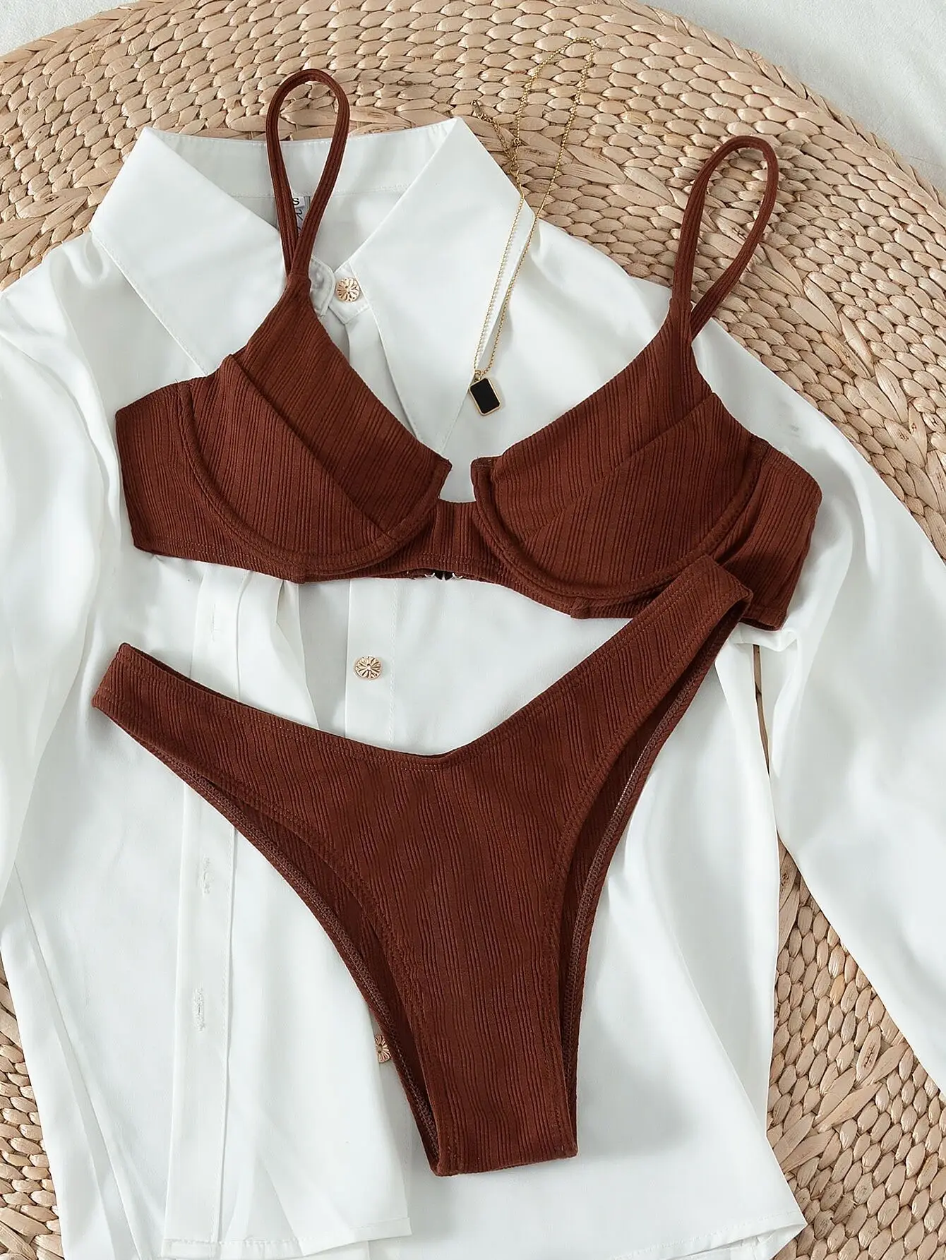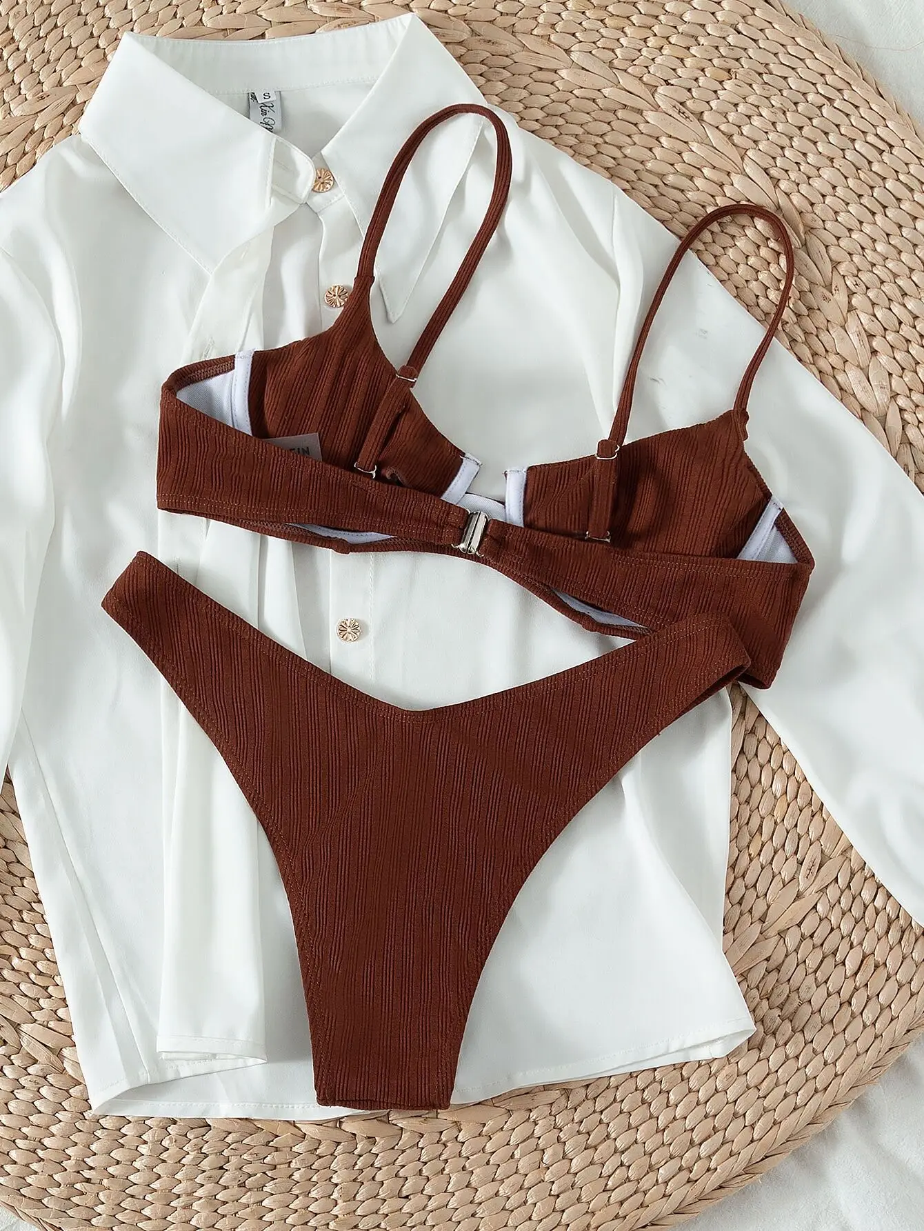 Сексуальный пуш-ап бикини 2022, Женский однотонный коричневый бюстгальтер с v-образным вырезом, купальник с высокой посадкой, пляжный купальный костюм, купальник, бикини