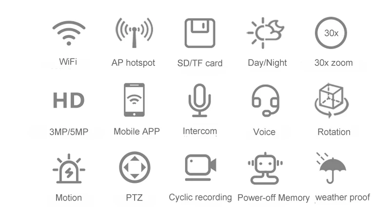 Датчик камеры: 5.0MP SONY CMOS сенсорОбщее количество пикселей: 5 МпВыходной пиксель: Макс 2560*1920,Зум: 30x оптический + цифровой зумОбъектив: f = 4,7-94 ммМин. Освещение: 0 люкс (светодиодный)ONVIF: ПоддержкаМобильный телефон-монитор: CamHiТочка доступа: ПоддержкаWiFi: 802.11b/g/nГолос: макс. 15 мГоворить: Макс 60 мSD/TF карта: макс. 128 Гб (не входит в комплект)Ночное видение: IR/Color/Smart mode опциональноРасстояние ночного видения: ИК Макс 100 м, Цвет Макс 40 мСковорода: 355 градусовНаклон: 90 градусовПанорамирование/наклон скорость: 0,1-60 градусов/sМощность: DC 12V 2AРабочая температура: -40 °- 70 °Вес: 2,5 кг