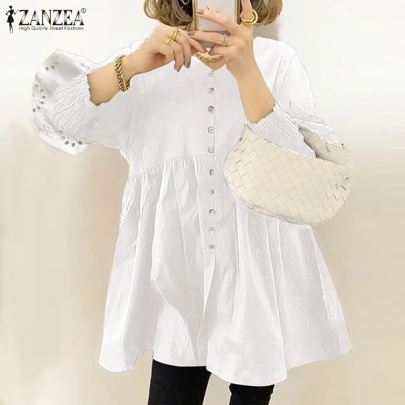 Модная женская офисная рубашка ZANZEA, осенняя блузка с длинными рукавами-фонариками и вырезами, элегантные блузы, однотонная свободная туника, топы, женская рубашка