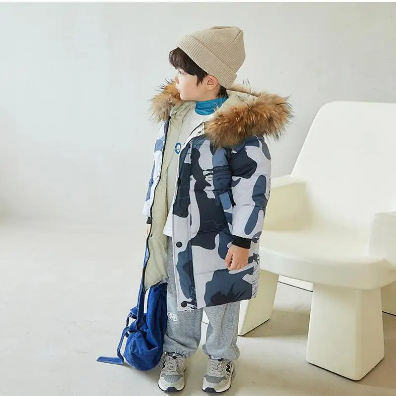 Длинное пальто с капюшоном и камуфляжным мехом для маленьких мальчиков на русскую зиму хлопковый пуховик для маленьких девочек детская одежда для подростков, пальто