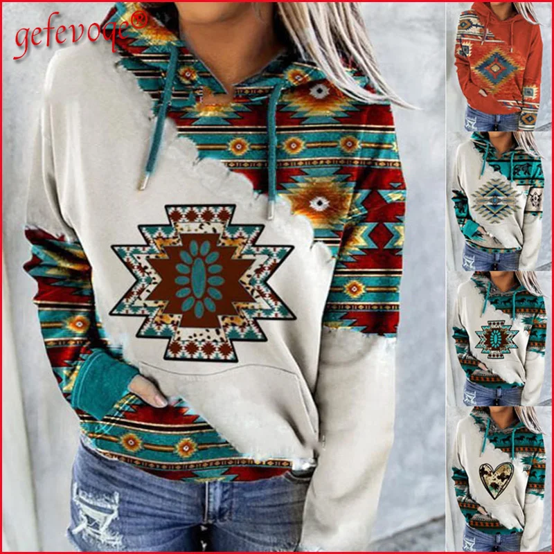 Женский пуловер с капюшоном, Повседневный пуловер с длинным рукавом и винтажным принтом, одежда для улицы, осень 2021