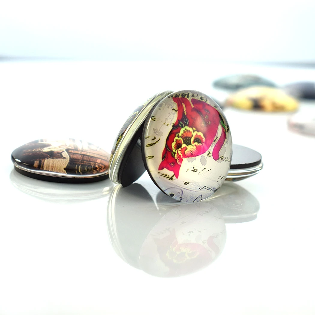 Диаметр 30 мм: мини и мило, легко носить с собой.Переднее стекло: яркое и красивое. Уникальное украшение.Задняя Магнитная сторона: легко снимается, никаких следов. Простой в использовании, может использоваться Магнитная доступная плоскость.