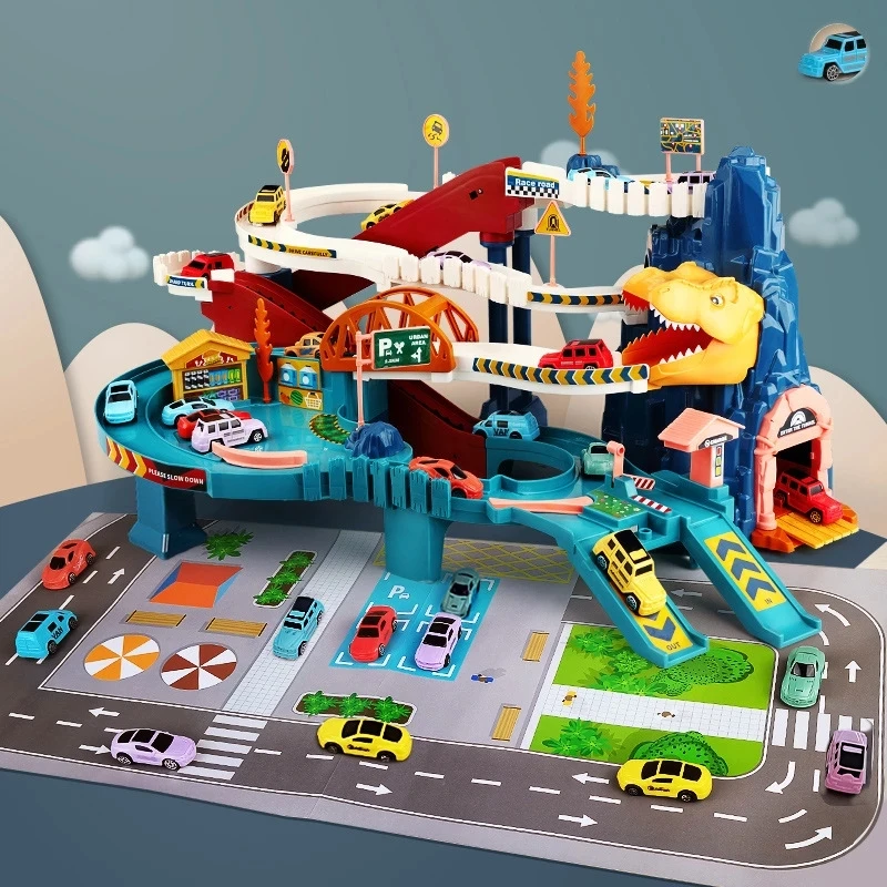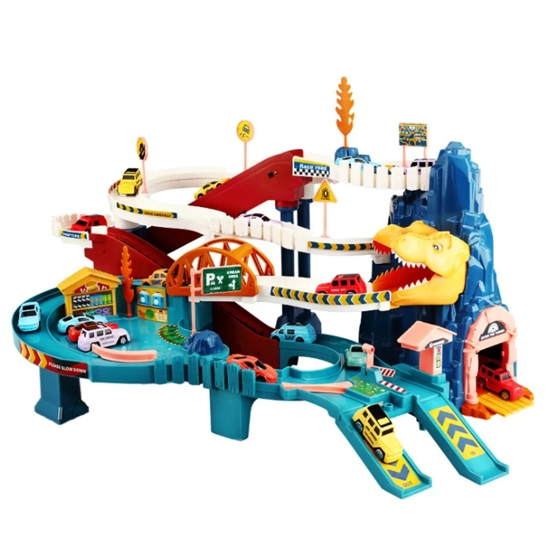 Игрушечный динозавр, железнодорожный путь, игрушечный автомобиль, динозавр, приключения, изогнутая дорога, электрорельсовый автомобиль, детские игры для мальчиков, подарки на день рождения