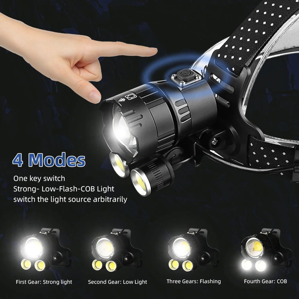 Светодиодный налобный фонарь XHP199, самый мощный, перезаряжаемый, 2 COB, уличный, водонепроницаемый, с масштабируемым налобным фонариком, с аккумулятором 18650