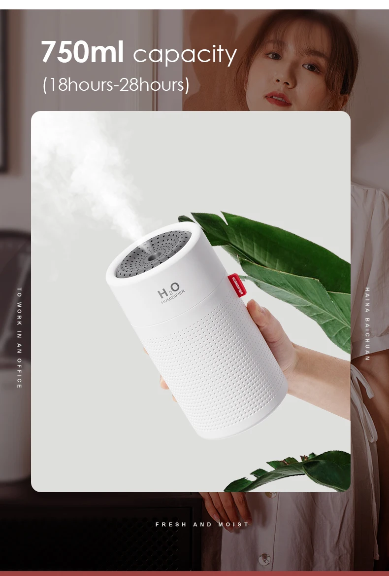 750 мл большая емкостьИзбегайте частого добавления воды.Аккумулятор большой емкости 2000 мАч;Двухступенчатый режим распыления: непрерывный спрей и прерывистый спрей;Устойчивое использование в течение 18-28 часов, с датчиком уровня воды, автоматическое определение уровня воды,Автоматическое выключение при нехватке воды для предотвращения сухого горения;Красочный ночной Светильник, бесшумное увлажнение.