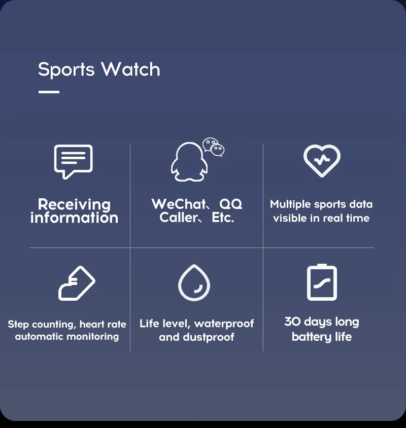 Использует больший 1,3 дюймового дисплея может быть большего слов, чётче, высокая чувствительность к касанию, экран может достигать различных операций, смарт-напоминание, Bluetooth, камера, количество шагов, калорий, мониторинга сна прослушивание музыки через Bluetooth, пульс быстро просматривает различные функции, и сенсорная работа большого цветного экрана более гладкая, И умная жизнь начинается с тех пор.