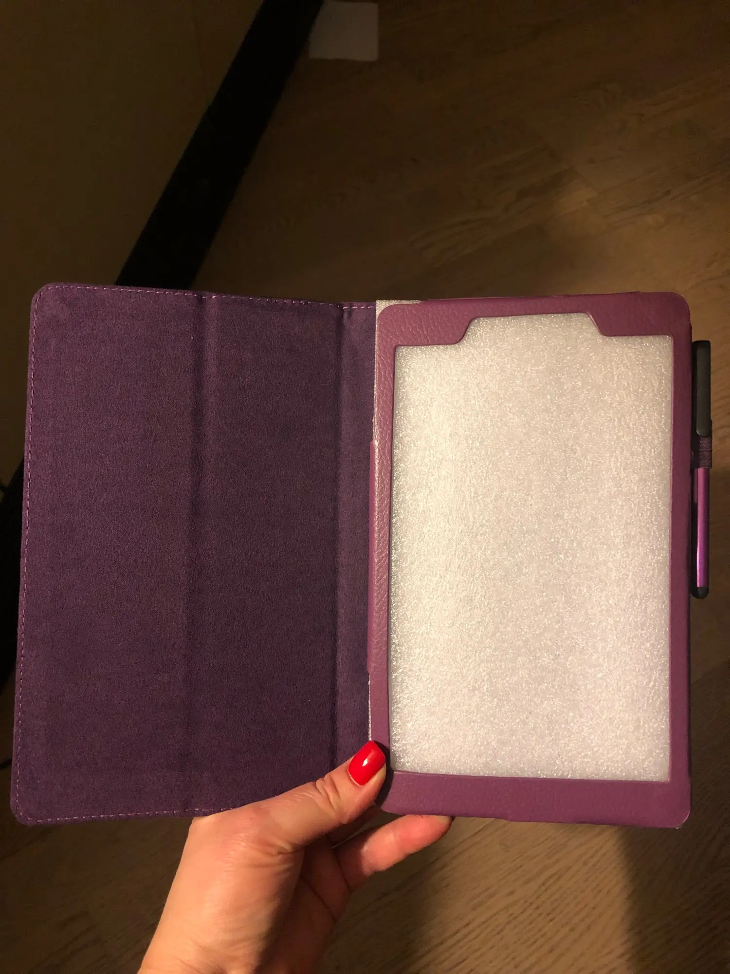 Чехол удобный, всё хорошо, единственно, можно было бы ещё на него придумать застёжку, когда в сложенном состоянии. Но как здорово, что не надо пальцем касаться, а есть к чехлу специальный мягкий указатель. Это был приятный сюрприз. Товар пришёл неожиданно быстро. Очень довольна.