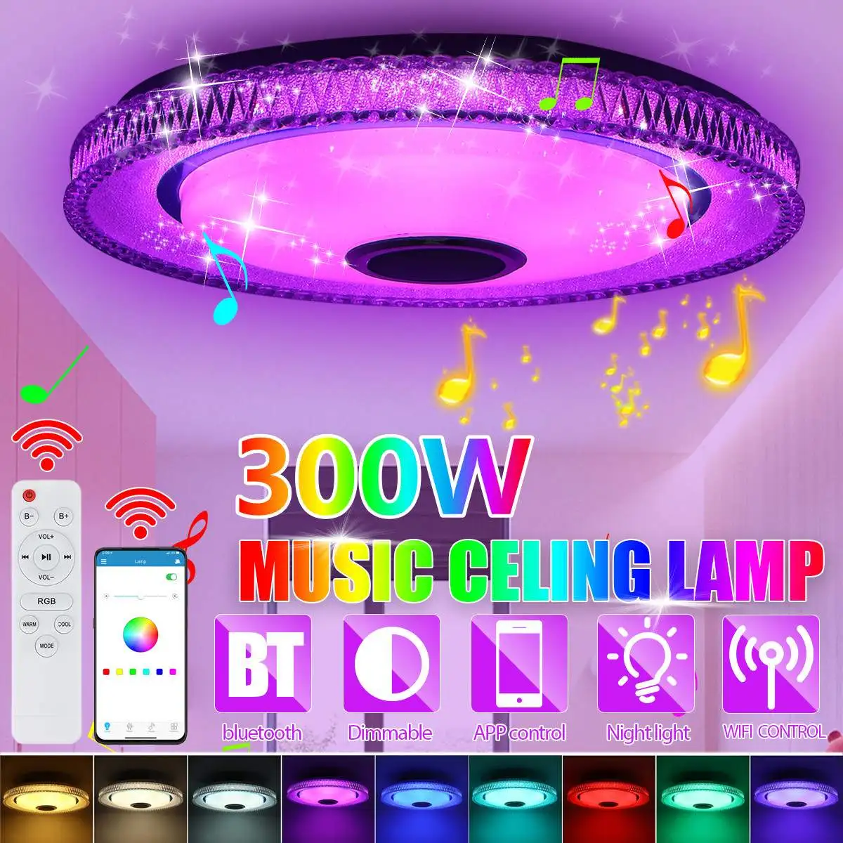 300 Вт WIFI светодиодный потолочный светильник RGB с утапливаемым креплением, круглая музыкальная лампа, умный потолочный светильник с дистанционным управлением