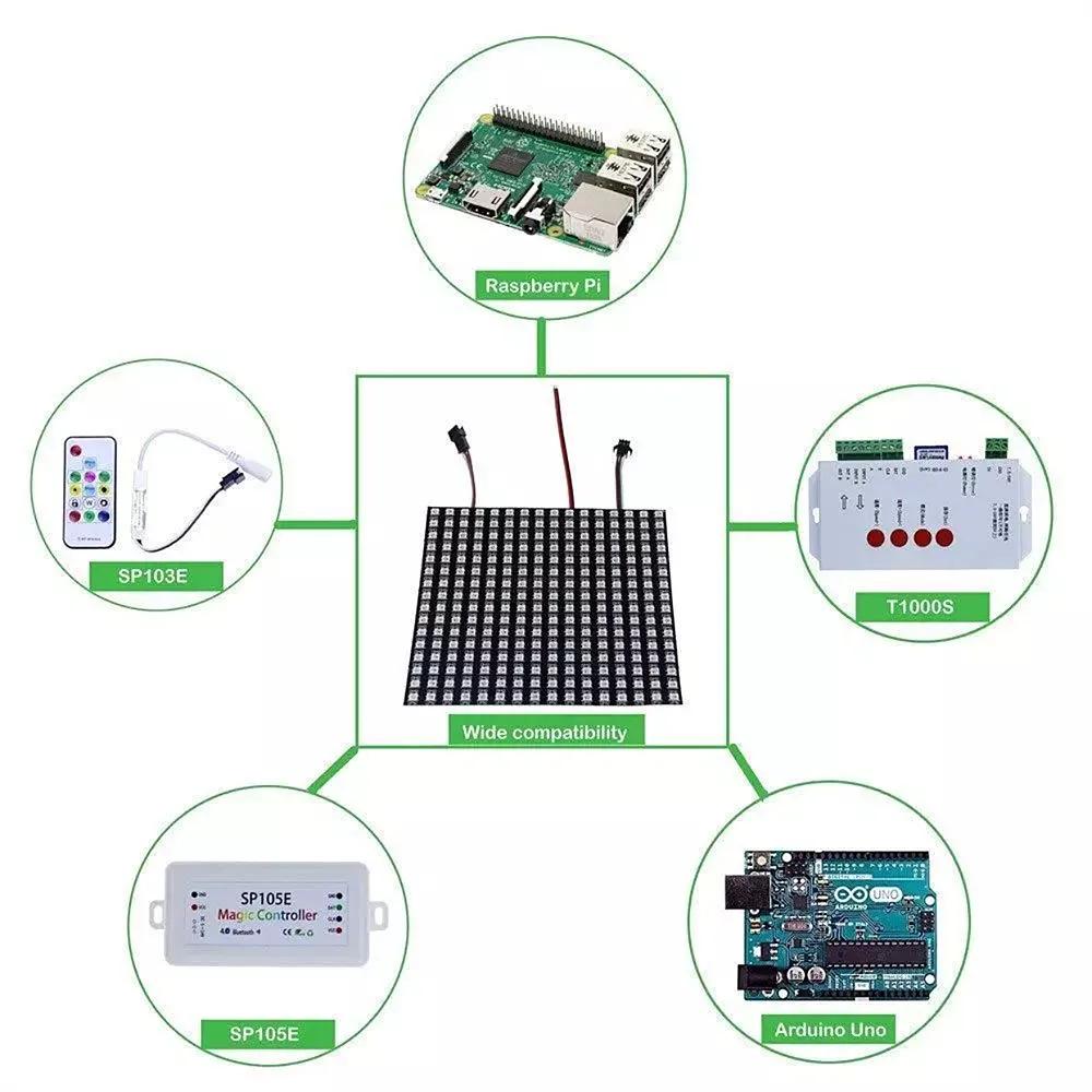 Три размера:8*8, 64 светодиода, 8 см * 8 см16*16, 256 светодиодов, 16 см * 16 см8*32, 256 светодиодов, 8 см * 32 смWS2812 светодиодная цифровая Гибкая световая панель (ws2811 контролируемый ИС),DC5V входРаботает с программируемым sd-контроллером (не входит в комплект), он может сделать гибкий светодиодный экранArduino IC цифровая Адресуемая Мечта Цвет RGB светодиодная лентаСовместимость с Arduino. Вы можете управлять полоской с помощью программируемого arduino.Преимущества технологииСветодиодный WS2811 SMD5050 RGB, каждый светодиодный встроенный (встроенный) IC WS2811, поэтому каждый светодиодный эффект можно контролировать, каждый светодиодный rgb-цифровой адресуемый.Простая установкаКаждый светодиодный светильник может быть произвольным отключением, хорошей гибкостью, простой установкой, может быть произвольным изгибом.Цветовое освещение мечтыКонтроллер подходит для использования, может отображаться красочная занавес-вверх/поток воды/капли дождя/прыжок вспышки и так далее сотни световых эффектов, вы также можете редактировать анимационный эффект с помощью программного обеспечения Coreldraw/flash/LedEdit.ПрименениеИзготовление светодиодного экрана, светодиодной стены, рекламной доски. Применяется в гостиницах, KTV, барах, рекламных компаниях, отделочных компаниях, городском освещении, развлекательных и развлекательных местах.1. Цвет излучения: пиксель RGB , IC WS28122. Рабочее напряжение: DC5V3. Мощность: 0,3 W/pixel4. Уровень водонепроницаемости: не водонепроницаемый5. Режим работы: внешний контроллер Arduino совместим.6. Подключение: VCC: красный; GND: черный/белый; DAT: синий1. Светодиодный Материал:9 шт. чистая золотая линия, медный кронштейн (WS2812B).2. Светодиодный индикатор IV:Красный: 400-700mcd, Зеленый: 1000-1500mcd, синий: 200-400mcd (WS2812B).