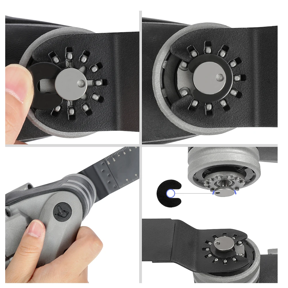 3. 【 Быстродействующее устройство 】наше лезвие пилы имеет механизм быстрого крепления, который может быть легко собран и заменен, и аксессуары могут быть быстро заменены без ключа или шестигранного ключа, тем самым экономя ваше время и усилия.