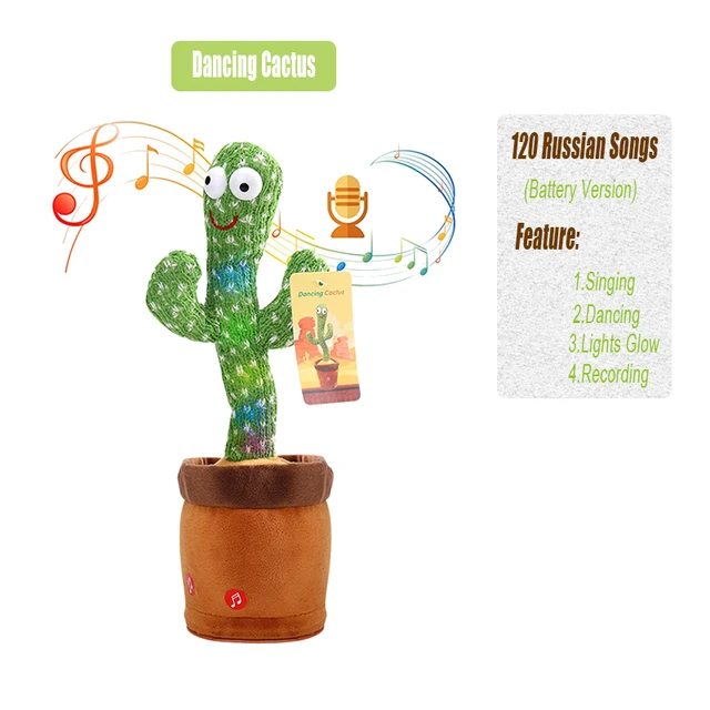 Записывающий кактус + повторяющийся кактус + говорящий кактус + имитирующий кактус + танцевальный кактус + мерцающий кактус, кактус для танцев и пения, игрушка-кактус для детей, это копирующая игрушка-кактус, принесет вам много удовольствия, наш кактус имеет 100 песен, языки песен-английский, испанский и музыкальный светильник.