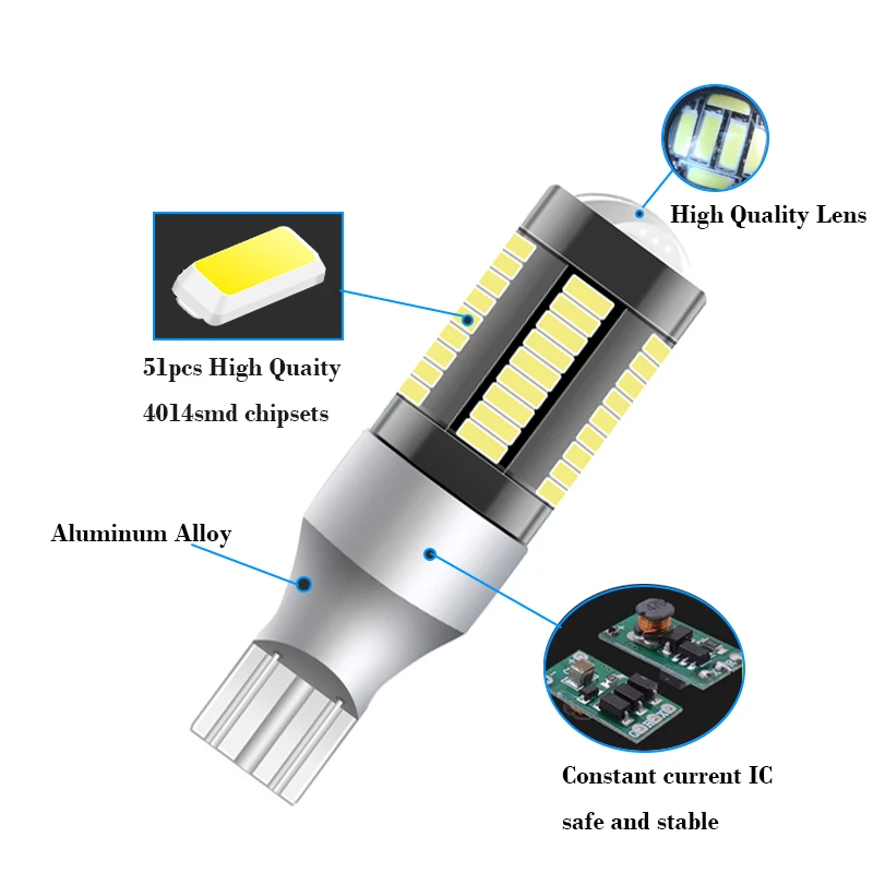 Заменяет гнездо: T15Светодиодный чип: 51 шт 4014 чиповЦветовая температура: белый 6000 КДоступное напряжение: 12 В постоянного токаУгол обзора (⑥):360 °Размещение на автомобиле: слева, справа, спередиПрименение: фонарь заднего хода.