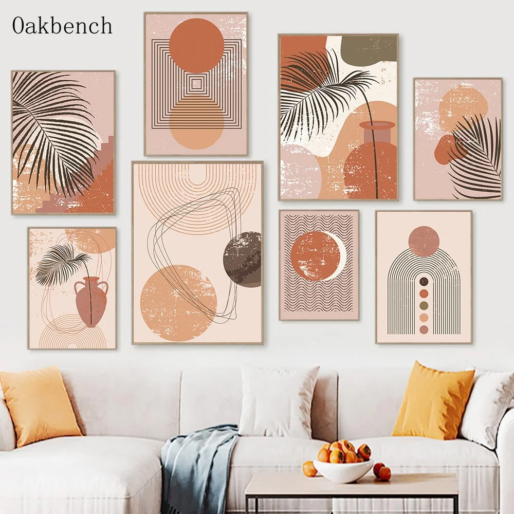 Постер на холсте в стиле бохо, цветные блочные картины с принтом листьев, абстрактные линии, постеры с изображением солнца, луны, винтажные настенные картины, домашний декор
