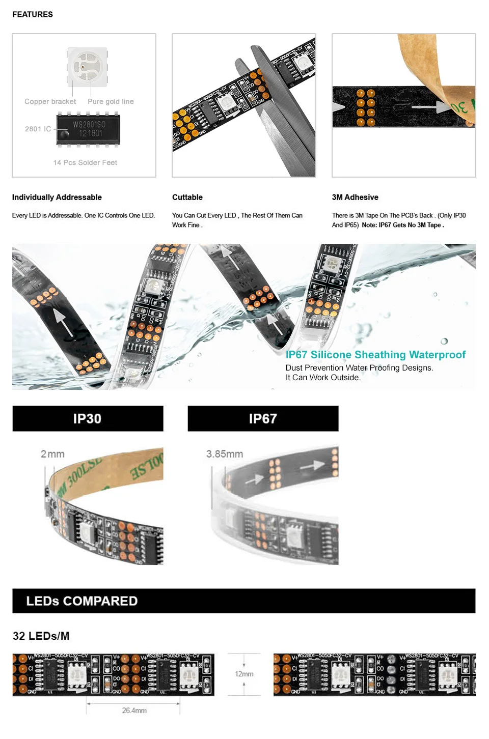 Светодиодная ленсветильник WS2801 2801 RGB 1 м, 2 м, 3 м, 4 м, 5 м, 32 светодиосветодиодный s Chip Led светильник s IP30 67 индивидуально Адресуемая 12 мм полноцветная, 5 В