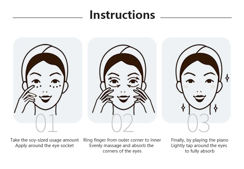 1. Крем для глаз богат коллагеном, который помогает уменьшить морщины.2. Эссенция ретинола уменьшает старение кожи глаз.3. Уменьшает синтез меланина и осветляет кожу вокруг глаз.4. Увлажняет кожу глаз, помогает уменьшить пятна и морщины.5. Массаж крем для глаз, чтобы помочь удалить темные круги и мешки под глазами.6. Легкость зрения, защита ярких и очаровательных глаз.