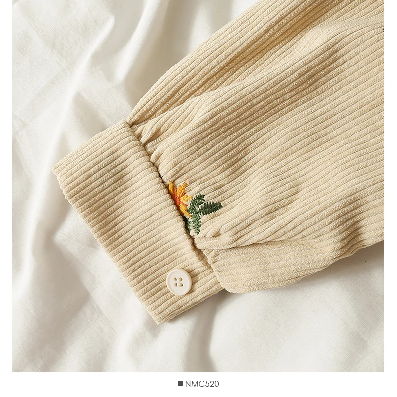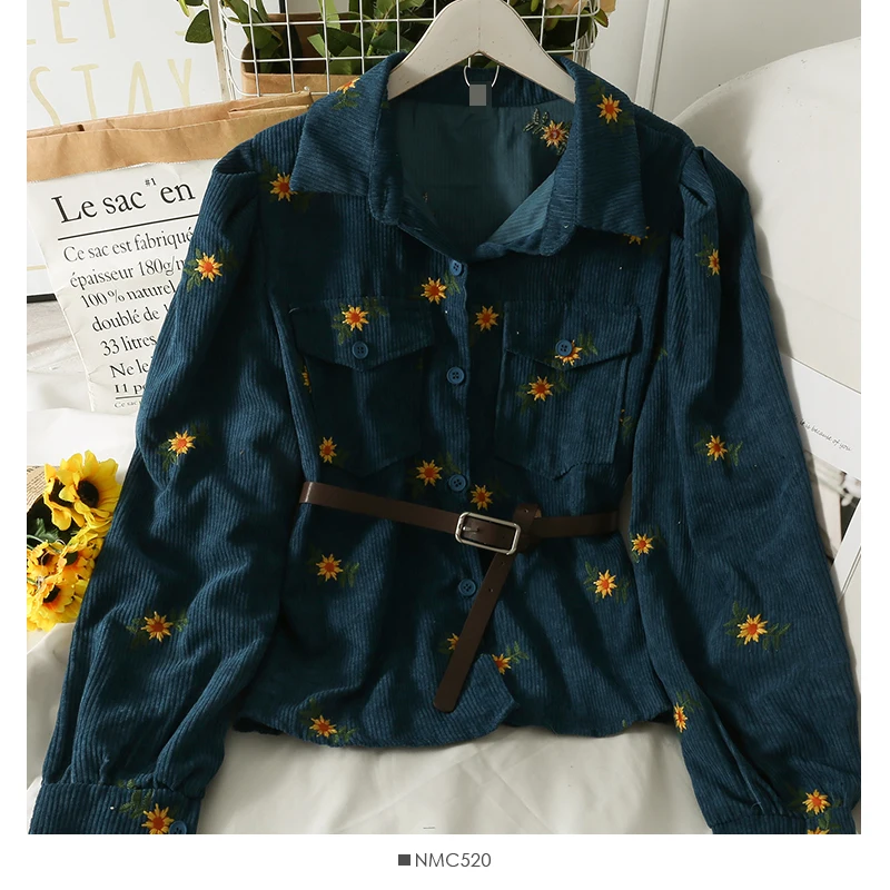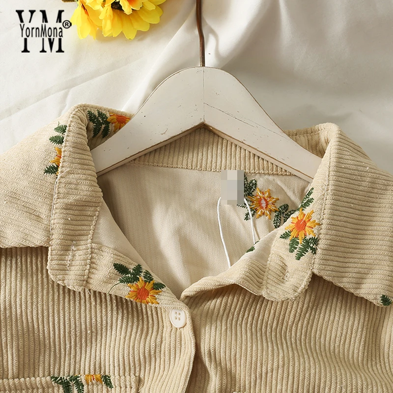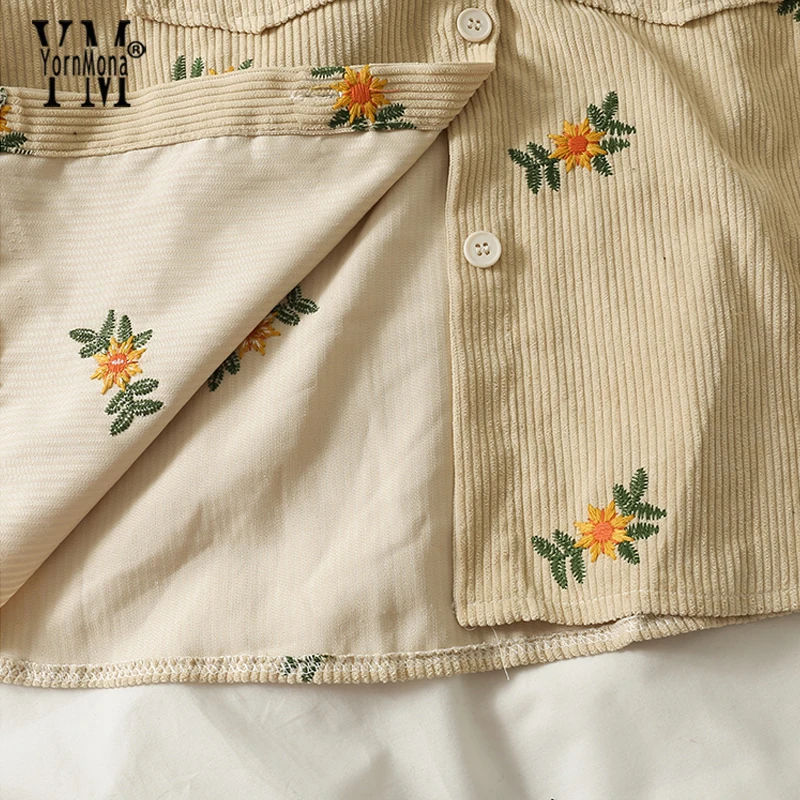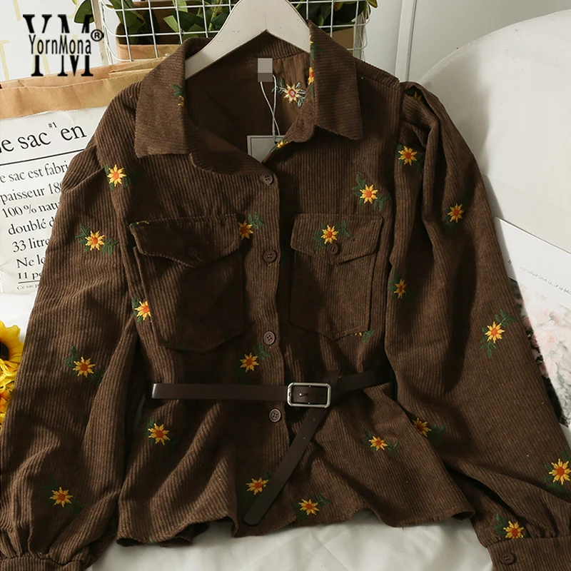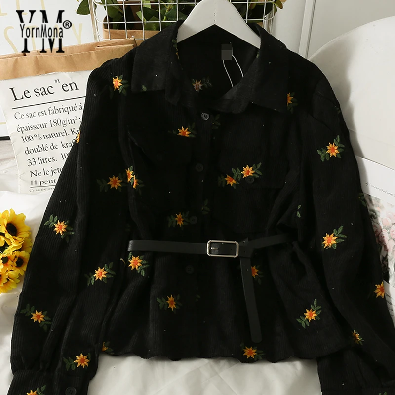 Модные вельветовые рубашки YornMona в стиле Харадзюку с цветочным принтом, женские повседневные однобортные рубашки с длинным рукавом и карманами, блузка, топы с поясом