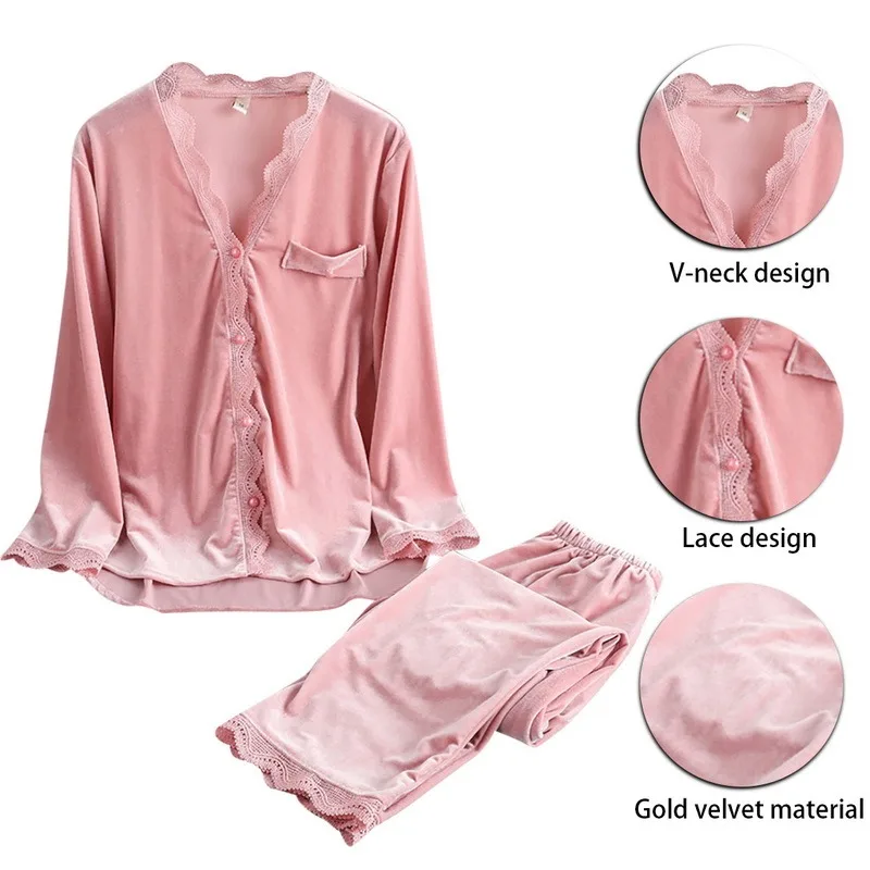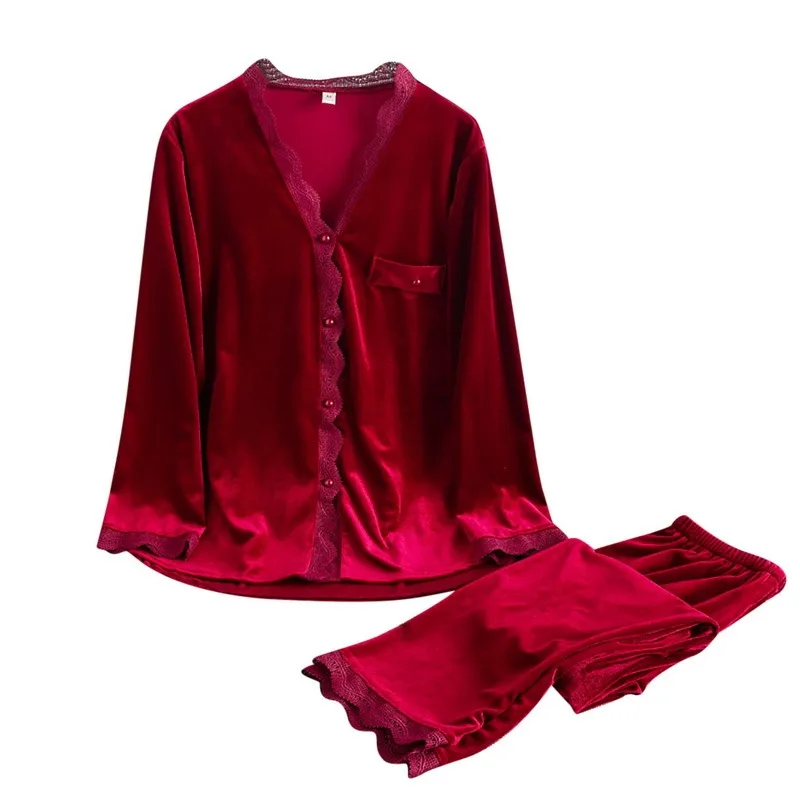Красная бархатная женская пижама с длинным рукавом домашний костюм одежда для сна теплая кружевная Пижама домашняя одежда для сна Повседневный Женский комплект осенний костюм 2021