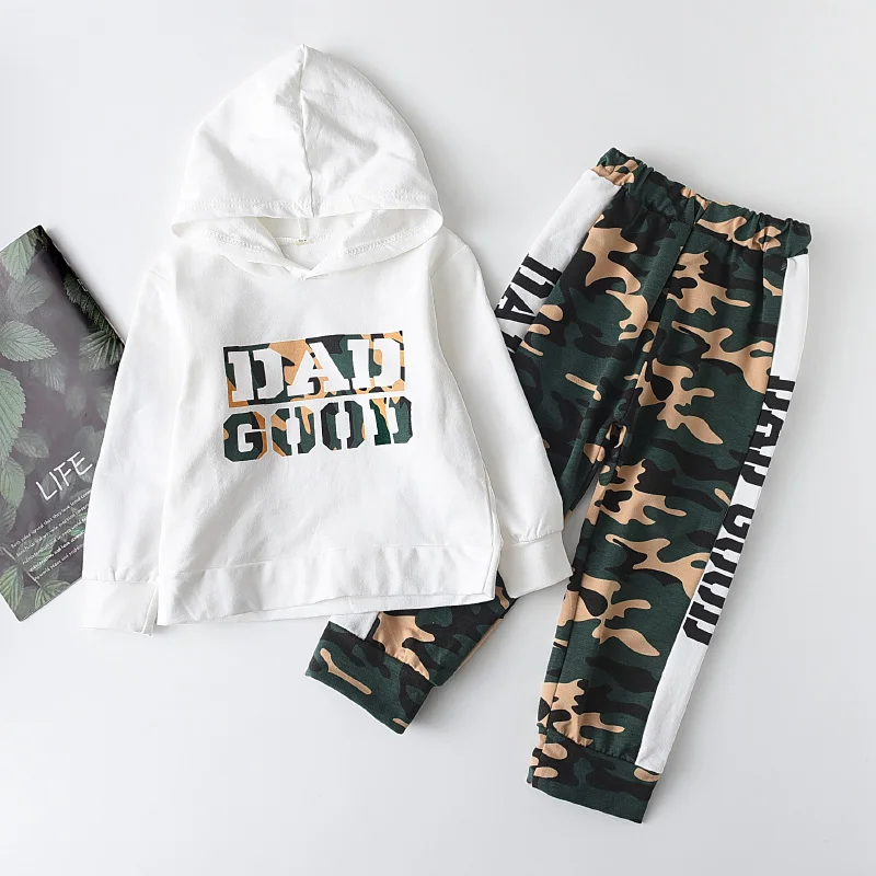 Комплекты детской модной одежды для мальчиков, новинка, Осенний топ с буквенным принтом для малышей, камуфляжный костюм из 2 предметов, повседневная одежда для маленьких девочек