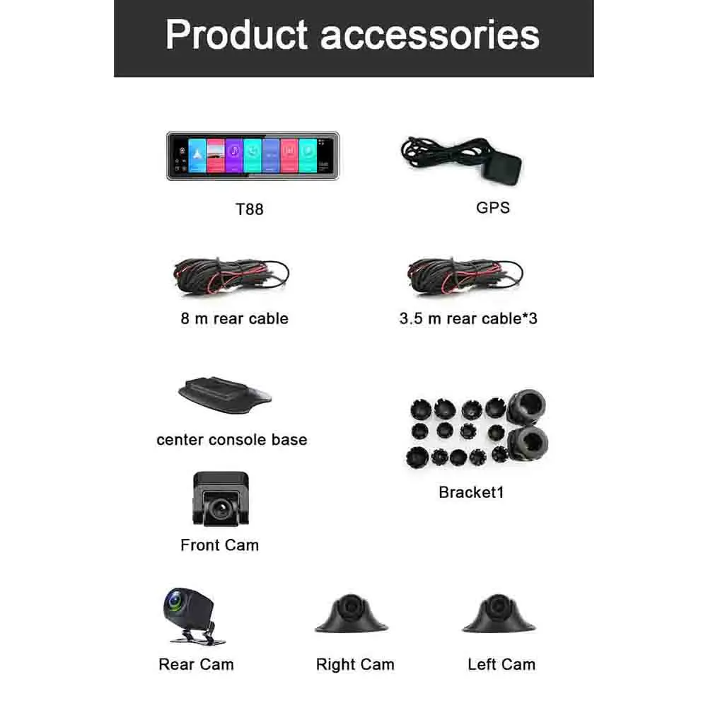 1 X Dashcam4 камеры1 X Кабель задней камеры 8 метров1X3,5 метров осталось Камера кабель1X3,5 метров прямо Камера кабель1 X Антенна GPS1 X основание центральной консоли1 х шнур питания1 X Руководство пользователя
