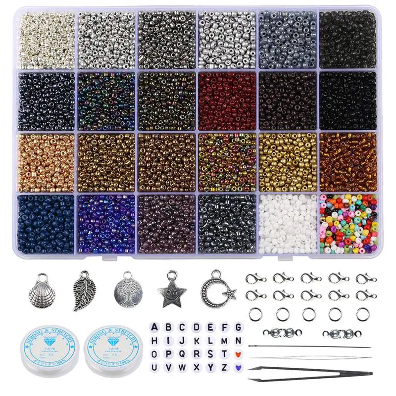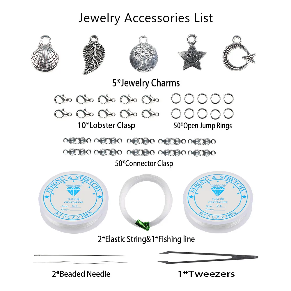 1 * стеклянные бусины в коробке270 * бусины с буквами5 * ювелирные подвески50 * Открытые Кольца для прыжков10 * застежка-лобстер50 * Соединительная застежка2 * эластичная веревка и 1 * леска2 * ведущий провод1 * пинцет