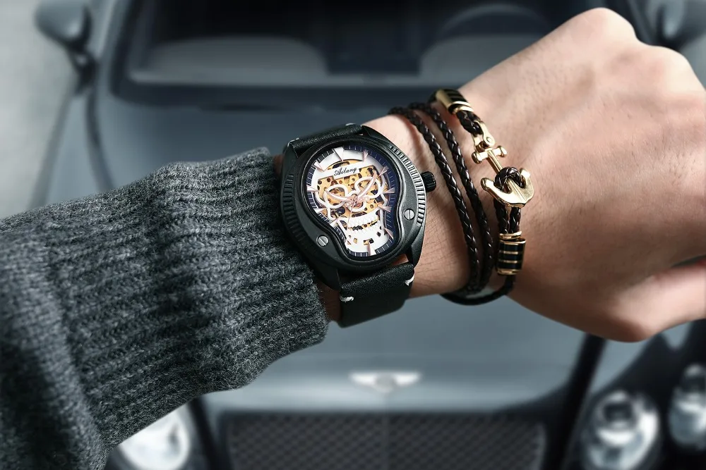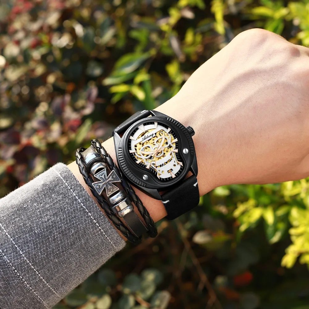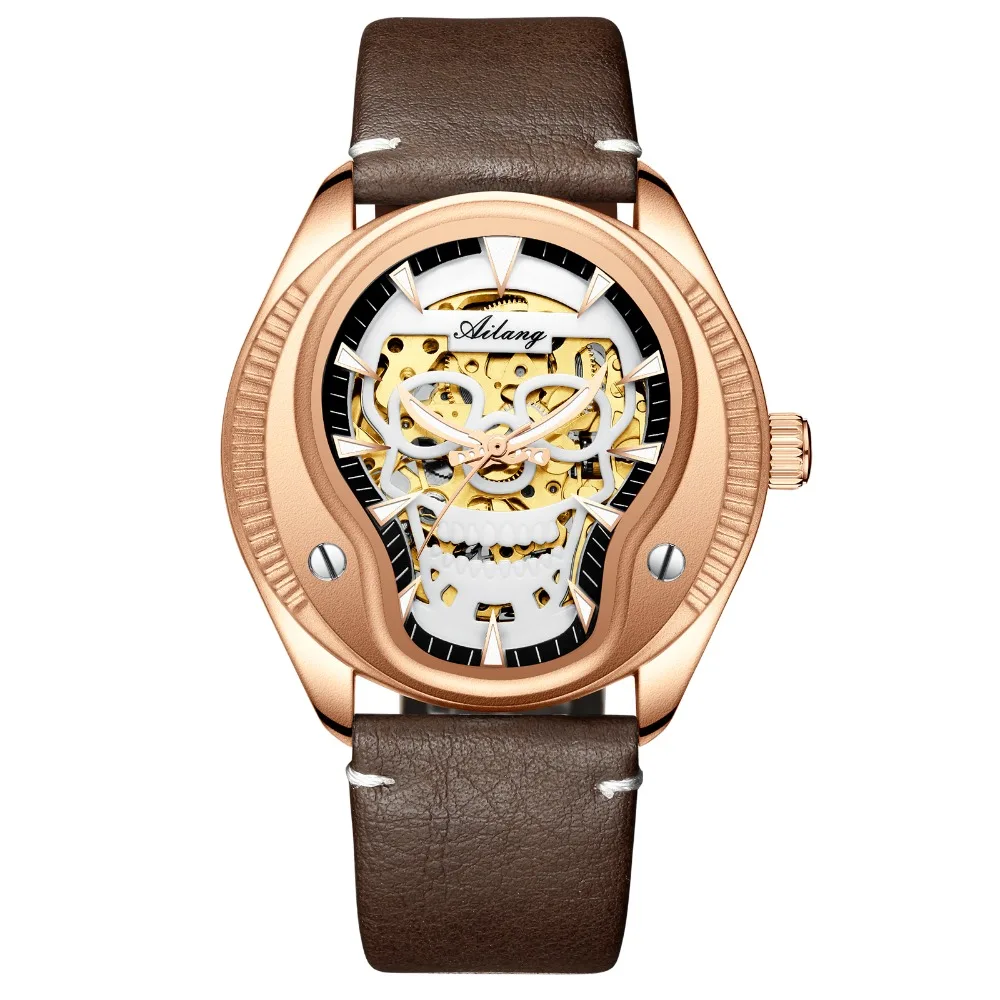 Мужские светящиеся наручные часы с позолоченным черепом, автоматические наручные часы с автоматическим подсветкой, полые часы-скелетоны, мужские кожаные часы 2021