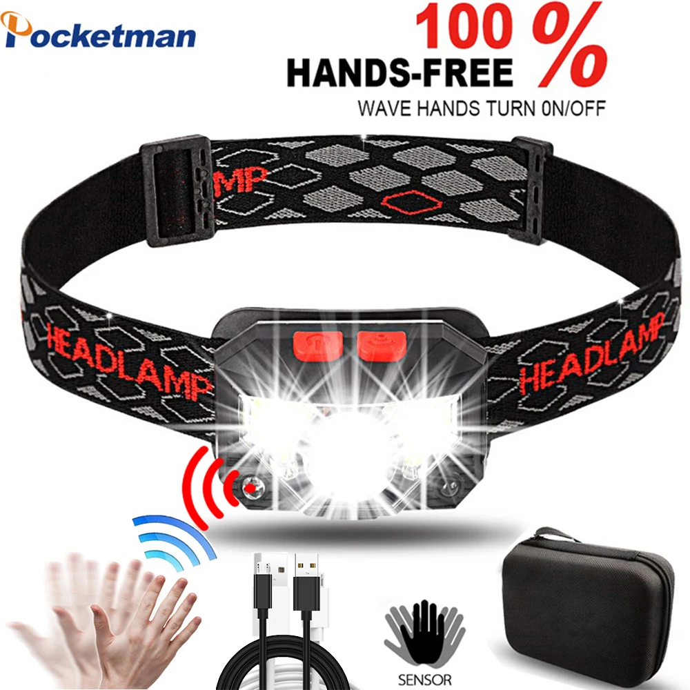 Мощный светодиодный головсветильник фонарь с датчиком, Головной фонарь с зарядкой от USB, Головной фонарь, водонепроницаемый Головной фонарь для кемпинга, походов