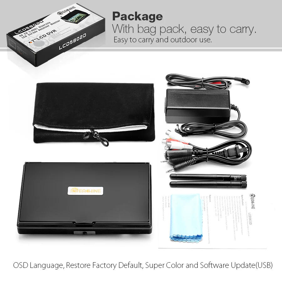 С функцией DVRВстроенный двойной приемник для лучшего приемаДвойной буферный av-выходНе влияет на 2,4 ГГц R/C радиоAv-ресивер с разнообразными входамиНебольшой, светильник, прочный5 полос и всего 40 каналовВстроенный аккумулятор, легко носить с собой и использовать на открытом воздухеКлюч к автоматическому поиску сигнала, простое управлениеЭкранный дисплей состояния работы: Всегда имейте в виду рабочее состояние устройства.