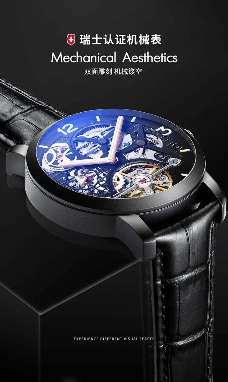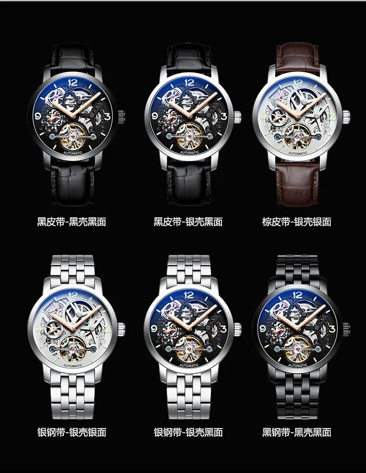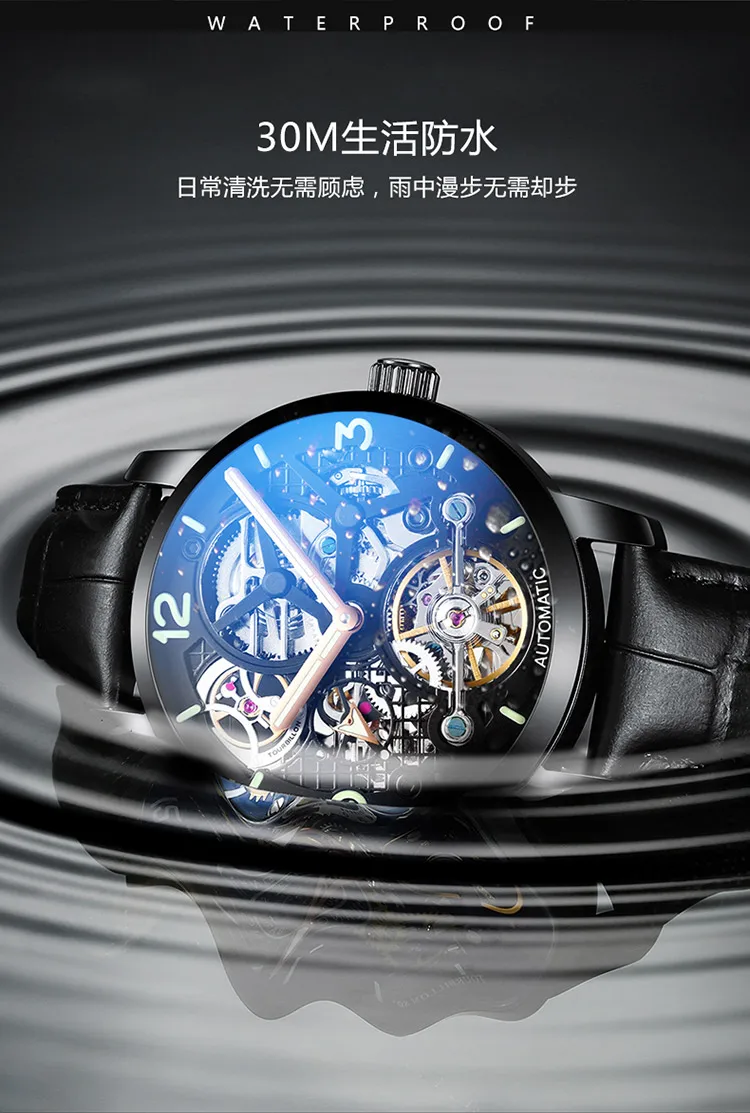 Часы наручные мужские автоматические с турбийоном, с кожаным ремешком
