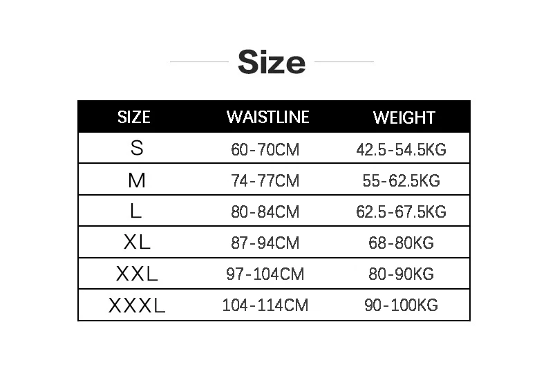 S: обхват талии 60-70 см; Подходящий вес 42,5-54,5 кг;