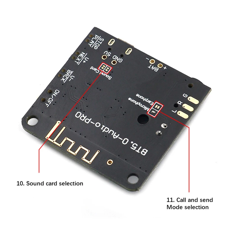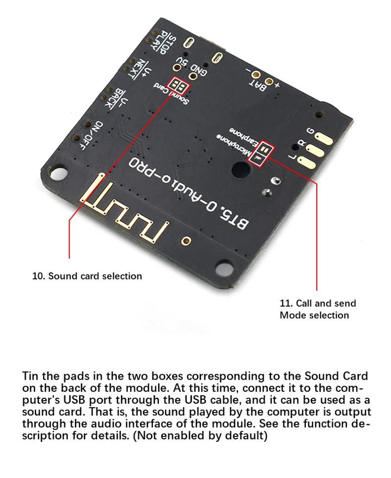 Переключение режима зарядки и разрядки в это время, после чего Bluetooth автоматически перезагружается, автоматически подключается и поддерживает предыдущее состояние воспроизведения) функция входящего голосового вызова: после подключения Bluetooth, включите звуковой режим вызова в настройках Bluetooth. Если телефонные звонки, вы можете ответить или повесить телефон через кнопку PLAY/STOP. Вы можете отправить товар напрямую от микрофона оригинальная гарнитура (при условии, что гарнитура имеет функции вызова, который представляет собой 4-сегментный тип и т. п.) либо Встроенный микрофон (по умолчанию), подробнее см. Описание функции. Когда используется звуковая карта компьютера: Закрепите колодки в двух коробках, соответствующих звуковой карте на задней части модуля, затем подключите его к usb-интерфейсу компьютера через usb-кабель, который может использоваться в качестве звуковой карты. То есть звук, воспроизводимый компьютером, выводится через аудиоинтерфейс модуля. Подробнее см. Описание функции. (По умолчанию не включено) размер изделия: