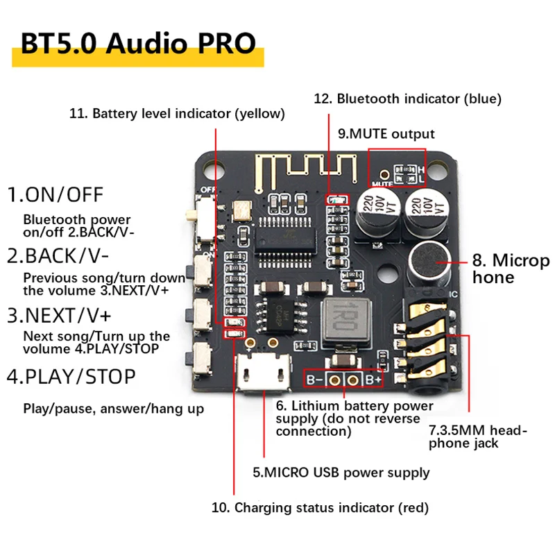 BT5.0 Audio PRO продолжает выполнять отличные основные функции M28 (передача на дальние расстояния, обратная совместимость с Bluetooth 5,0, качество звука без потерь и т. д.) и добавляет более удобную для пользователя производительность следующим образом: зарядка во время установки: Этот продукт имеет цепь зарядки и разрядки, которая может непосредственно заряжать аккумулятор через источник питания USB, И Bluetooth может продолжать нормально работать во время процесса зарядки и действительно реализовывать функцию зарядки и разрядки. Решить болевую точку, что некоторые продукты не могут быть использованы во время процесса зарядки. Питание только от USB: мигает красный светильник, что указывает на то, что источник питания является нормальным. При питании от отдельной батареи: всегда горит желтый светильник, что указывает на то, что источник питания батареи нормальный; Мигает желтый светильник, что указывает на низкий уровень заряда батареи. Когда USB и аккумулятор подключены одновременно: Красный светильник мигает, указывая, что аккумулятор заряжается; Красный светильник всегда указывает на то, что аккумулятор полностью заряжен. (Обратите внимание, что если вход USB неожиданно отключен во время процесса зарядки и разрядки, будет несколько секунд перерыва из-за