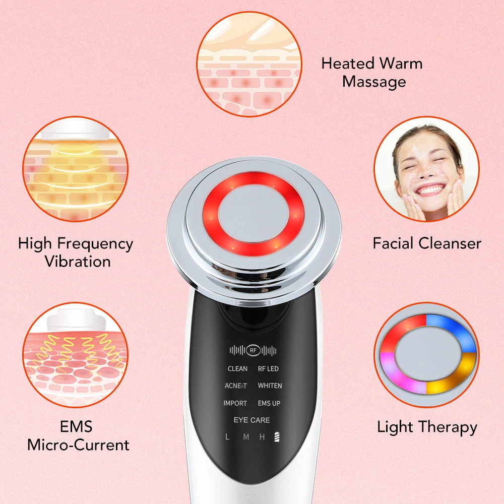 Особенности:【 7 режимов и 3 редуктора. В наличии 7 различных режимов и 3 механизма Настраиваются для различных потребностей и различных типов кожи.【Sonic + Функция горячего сжатия: 】мгновенно проникает питательная молекула в кожу.【 4 светодиода】фотонный свет управляется кнопкой [Power], красный свет, синий свет, оранжевый свет, красочный свет).【Удобный дизайн для пользователей 】большой ЖК-дисплей для более читаемого использования, удобный базовый дизайн для удобной зарядки и хранения.【Несколько функций подтягивающий и укрепляющий, Повышение эластичности кожи, удаление морщин, омоложение и отбеливание кожи, расслабление мышц и массаж, а также лучшее питание.【Практичное использование 】оснащен специальной основой для косметического инструмента, более удобно разместить.7 режимов:1) режим очистки: глубоко очистите кожу.2) Режим активации: он может помочь восстановить эластичность кожи.3) Режим удаления акне: стимулирует кровообращение и анти-акне.4) Режим отбеливания: отбеливание и Осветление кожи.5) импортный режим: эффективный, чтобы привести лосьон для лучшего поглощения питания.6) режим лифтинга и подтягивания: восстанавливает эластичность кожи, делает кожу подтягивающей и гладкой, против морщин.7) режим ухода за глазами: сгладьте темные круги вокруг глаз.4 светодиодных ламп:1) красный свет: регенерация коллагена.2) синий свет: противовоспалительный и против акне.3) оранжевый свет: отбеливание и Осветление кожи.4) Яркий свет: подтягивающий и укрепляющий.Спецификация:Материал: АБС-пластикНапряжение: DC5V 1AМощность: 4 ВтЕмкость аккумулятора: 750 мА · чВремя зарядки: около 3 часовВремя использования: около 60 минут, может использоваться около 10 дней, если 5 минут в день.Светодиодные фонари: 4 (красный свет, синий свет, оранжевый свет, красочный свет)Режимы: 3Режимы: (очистка, активация, удаление акне, отбеливание, импорт, лифтинг и подтягивание и Уход за глазами)Длина шнура: 44 см ± 2 см1 х устройство, обеспечивающее вам красоту и привлекательностьРуководство пользователя-1 шт.;Подставка-1 шт.1 X usb-кабель для зарядки1 х фиксирующее кольцо