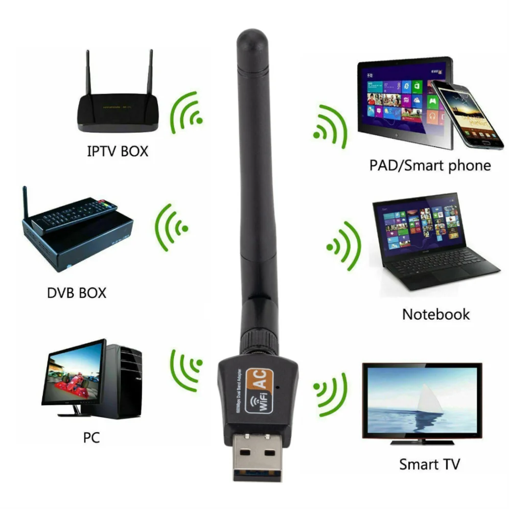 Особенности:Соответствует 2,4G и 5G IEEE802.11ac/a/b/g/nУлучшите скорость ноутбука WiFiПоддержка 1T1R и 2,4 ГГц/5 ГГц двойной частотыUSB 2,0 быстрее.С 2dBi расширителем антенны.Скорость беспроводной передачи данных до 600 Мбит/с (802.11ac), в соответствии с интернет-условиями для автоматической регулировки скорости беспроводной связиПоиск в Интернете и автоматическое изменение скорости передачиДва режима работы: Инфракрасная и специальнаяВниз компактность 802,11g/n интернет-устройствоИспользование технологии роуминга, обещает высокую эффективность беспроводного подключенияПроизводительность Wifi 600 Мбит/с (2,4G 150M/5,8G 433M)Поддержка операционной системы:Windows DriverWin 8,1 и OldДрайвер Windows (новый Win10)Драйвер Mac (Mac10.6,Mac10.8)Драйвер Mac (Mac10.9,Mac10.10)Посылка включает:1x Wi-Fi 5 ГГц/2,4 ГГц Беспроводной антенный адаптер1x CD драйвер
