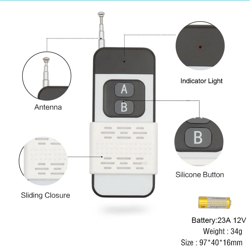 Особенности:1: Нажмите и удерживайте кнопку «A», реле включится; Отпустите кнопку, это реле выключится. (Режим дистанционного управления 1:Мгновенный режим)2: нажмите кнопку «A», реле включится; Нажмите кнопку «A» снова, это реле выключится. (Режим дистанционного управления 2:Режим переключения)3: нажмите кнопку «A», реле включится; Нажмите кнопку «B», это реле выключится. (Режим дистанционного управления 3:Режим блокировки)4: расстояние управления 1000 м.
