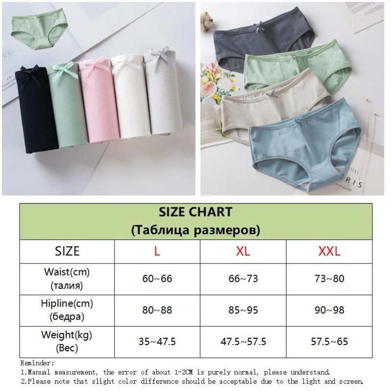100% Новинка, высокое качествоНаименование: нижнее белье, трусики, трусы, нижнее бельеДля: женщин/дам/девочекСтиль: милый/сексуальный/модныйРазмера плюс нижнее белье: бесшовные трусыХлопковые трусики: хлопокМатериал: 95% хлопок + 5% спандексПромежность: 100% хлопокРазмер: L,XL,XXLУкрашение: бантЦвет: разные трусикиПримечание:1. Из-за ручных измерений возможна погрешность в 1-3 см.2. Из-за разницы светильник щении и экранах цвет изделия может немного отличаться от изображения. Надеемся на ваше понимание.
