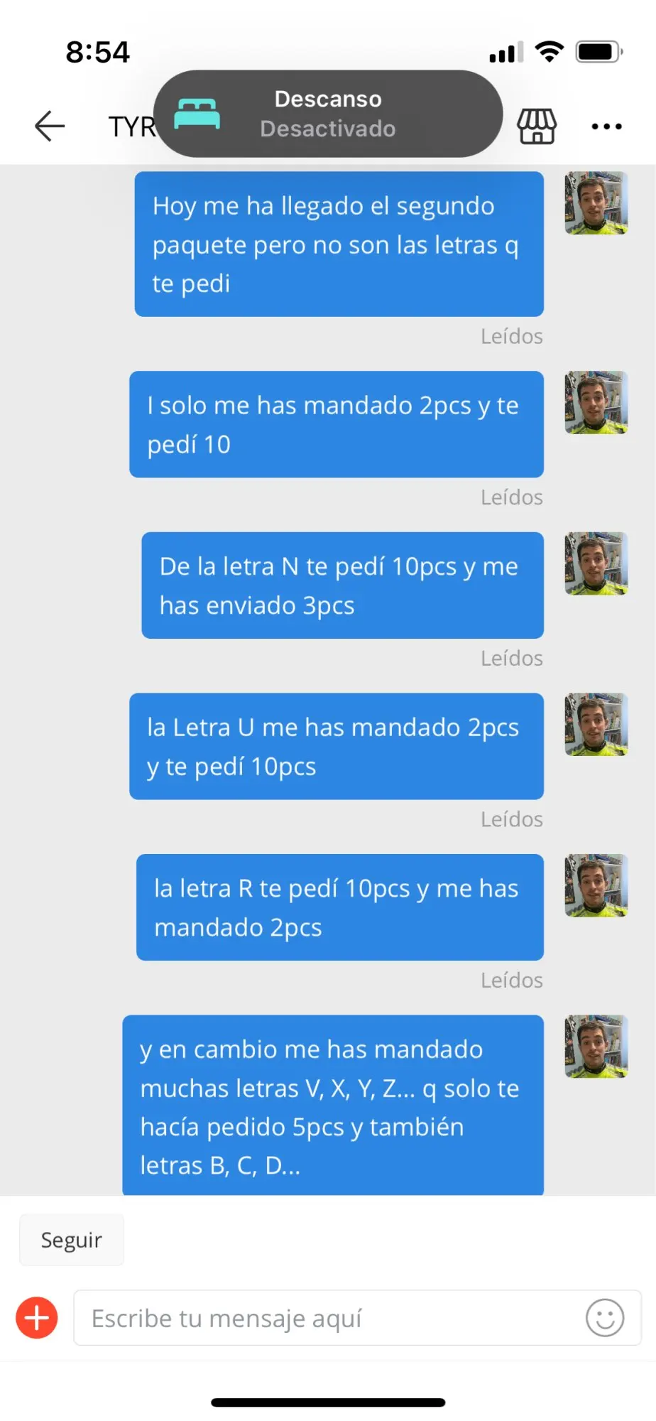 Я попросил несколько писем, и те, которые я хотел, не пришли, они прислали мне других, поэтому я открываю спор. И у меня проблемы с моими клиентами, поэтому мне пришлось купить то, что мне не хватает в другом месте. Катастрофа.