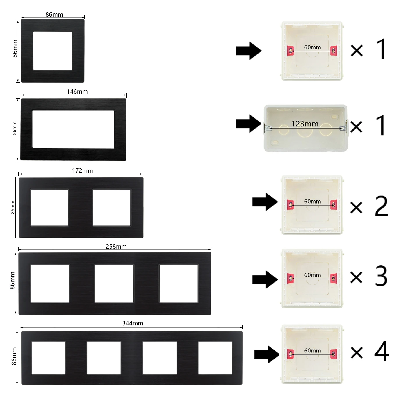 1. Тип товара: переключатель/модуль розетки/рамка2. Цвет: черный3. Материал панели: Матовый алюминий4. Номинальное напряжение: 110-250 В5. Великобритания розетка модуль Номинальный ток: 13A6. Универсальный модуль номинального тока: 13A7. Номинальный ток usb-модуля: около 2,1 А (медленная зарядка)8. RJ45 / Network / HDMI-совместимость и т. Д. Номинальный ток: слабый ток9. Размер оправы:1LS: 86 мм * 86 мм2LS: 172 мм * 86 мм3LS: 258 мм * 86 мм4LS: 344 мм * 86 мм146-LS: 146 мм * 86 мм