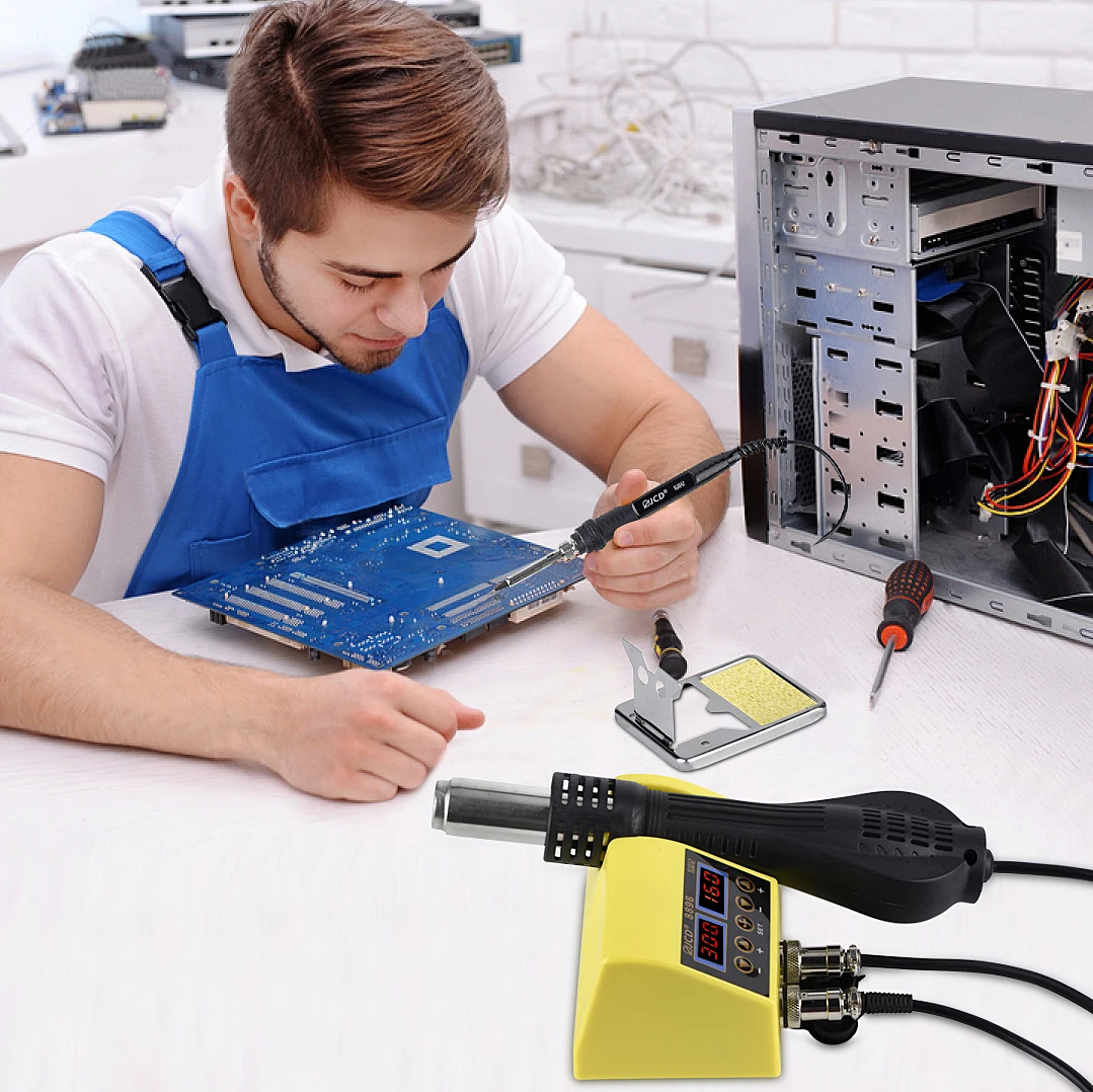 Нагреватель горячего воздуха и сварочный Утюг 2в1 паяльная станция.Двойные цифровые ЖК-дисплеи для отображения точной температуры.Чрезвычайно низкий уровень шума и компактный дизайн.Функция интеллектуального самообнаружения обеспечивает безопасную персональную работу.Функция автоматического охлаждения для эффективного продления срока службы нагревателя и защиты нагревателя горячего воздуха.