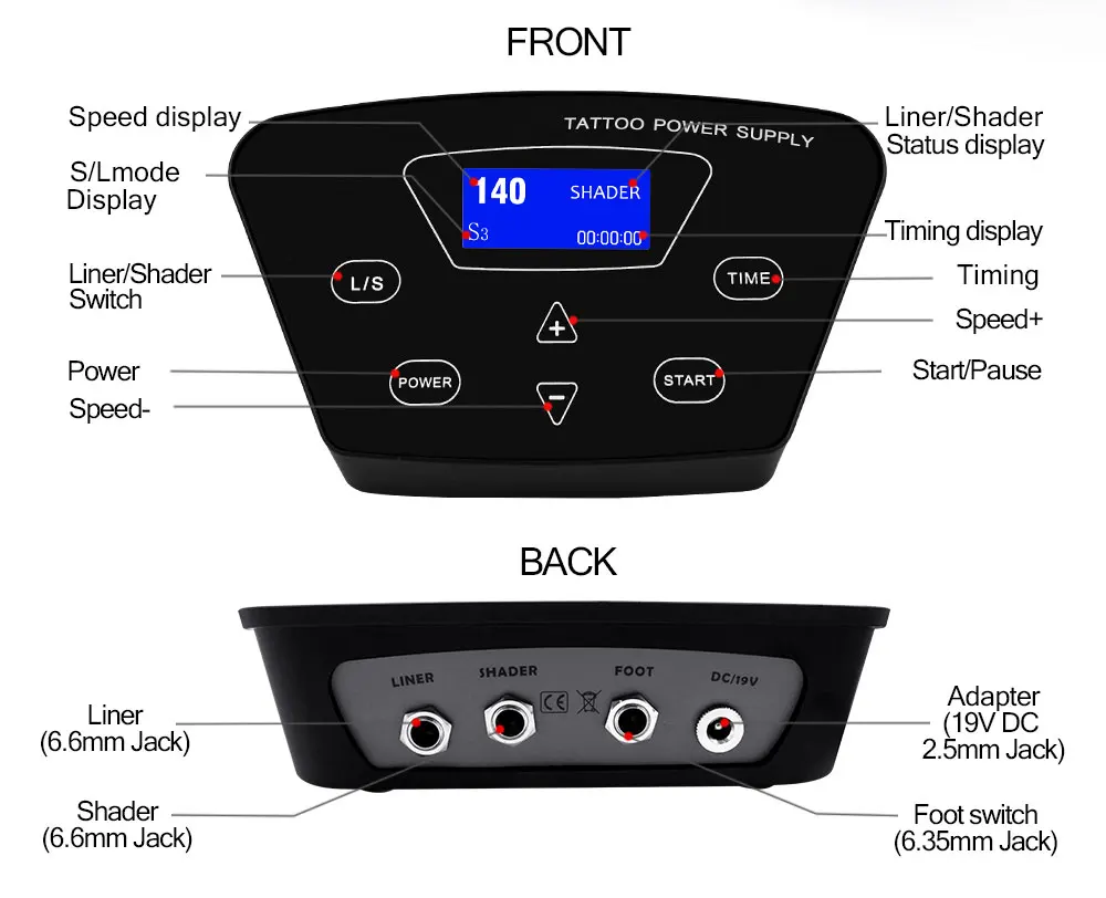 Тату-машинка:Номинальное напряжение: 5-13 В постоянного токаВыступ иглы: 0-4,5 ммХод поршня: 3,5 ммПодключение: разъем 3,5 ммСкорость ручки: Макс. 10000 об/минМотор ручки: Бессердечный двигательКорпус ручки: алюминиевый сплавИглы: картридж иглыТатуировками электропитания:Выходная мощность источника питания: Макс. 18В, 280NPSИсточник питания на входе: 90-240 ВКорпус блока питания: пластикРазмер источника питания: 16,8*9,8*5 см