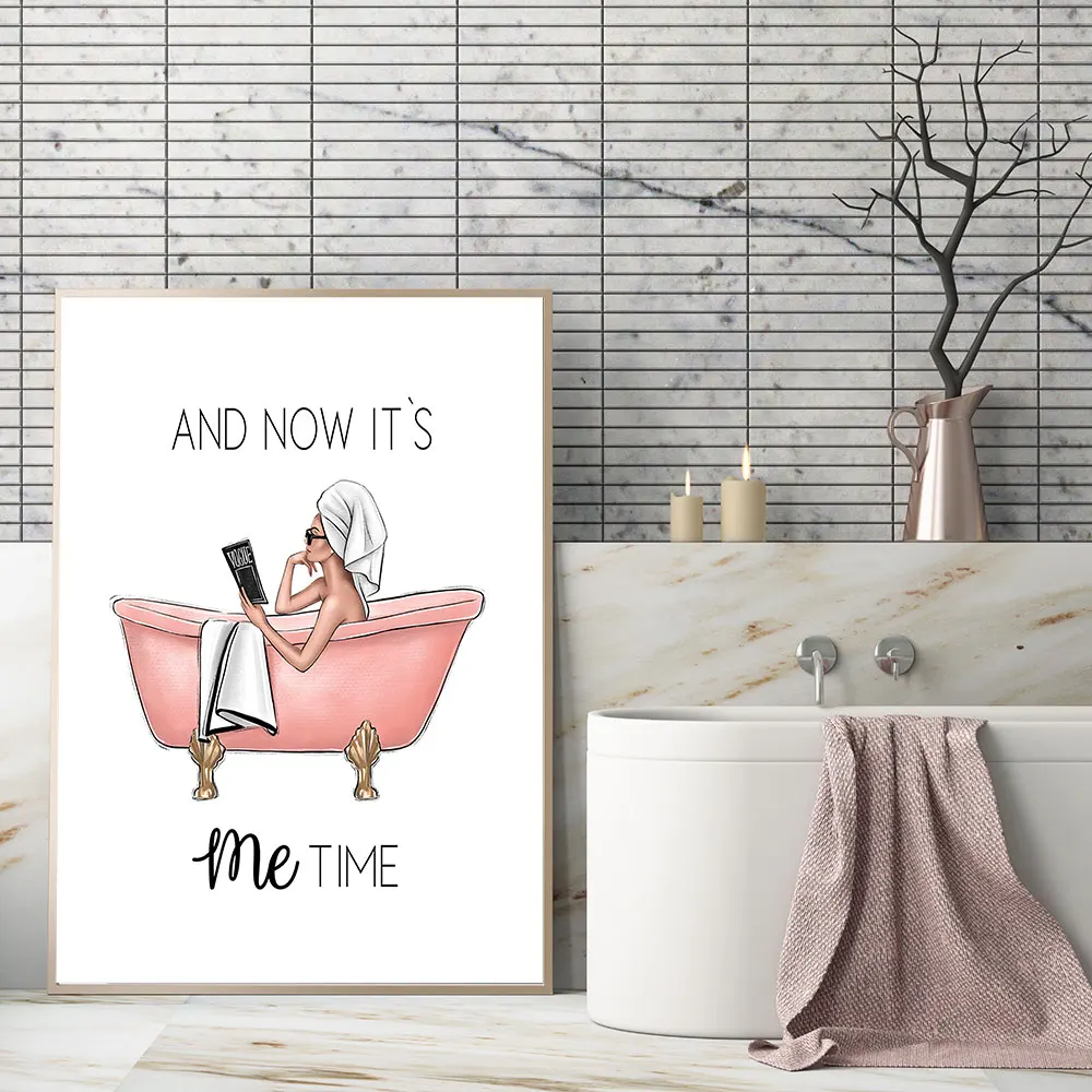 Картина на холсте, настенное искусство, румяна, розовая девушка, модный плакат Me Time, Минималистичная печать, скандинавский рисунок, расслабляющая картина, ванная комната, домашний декор