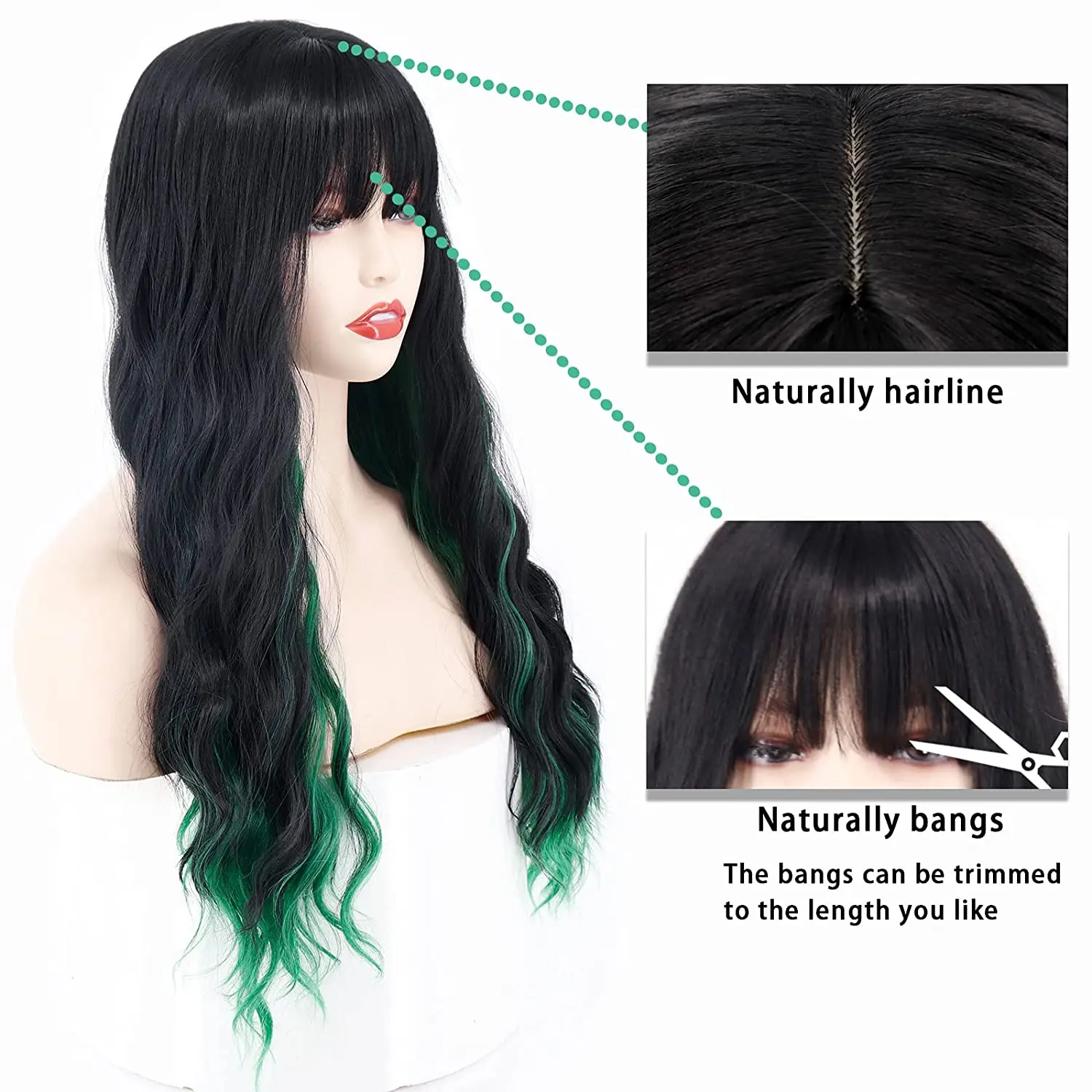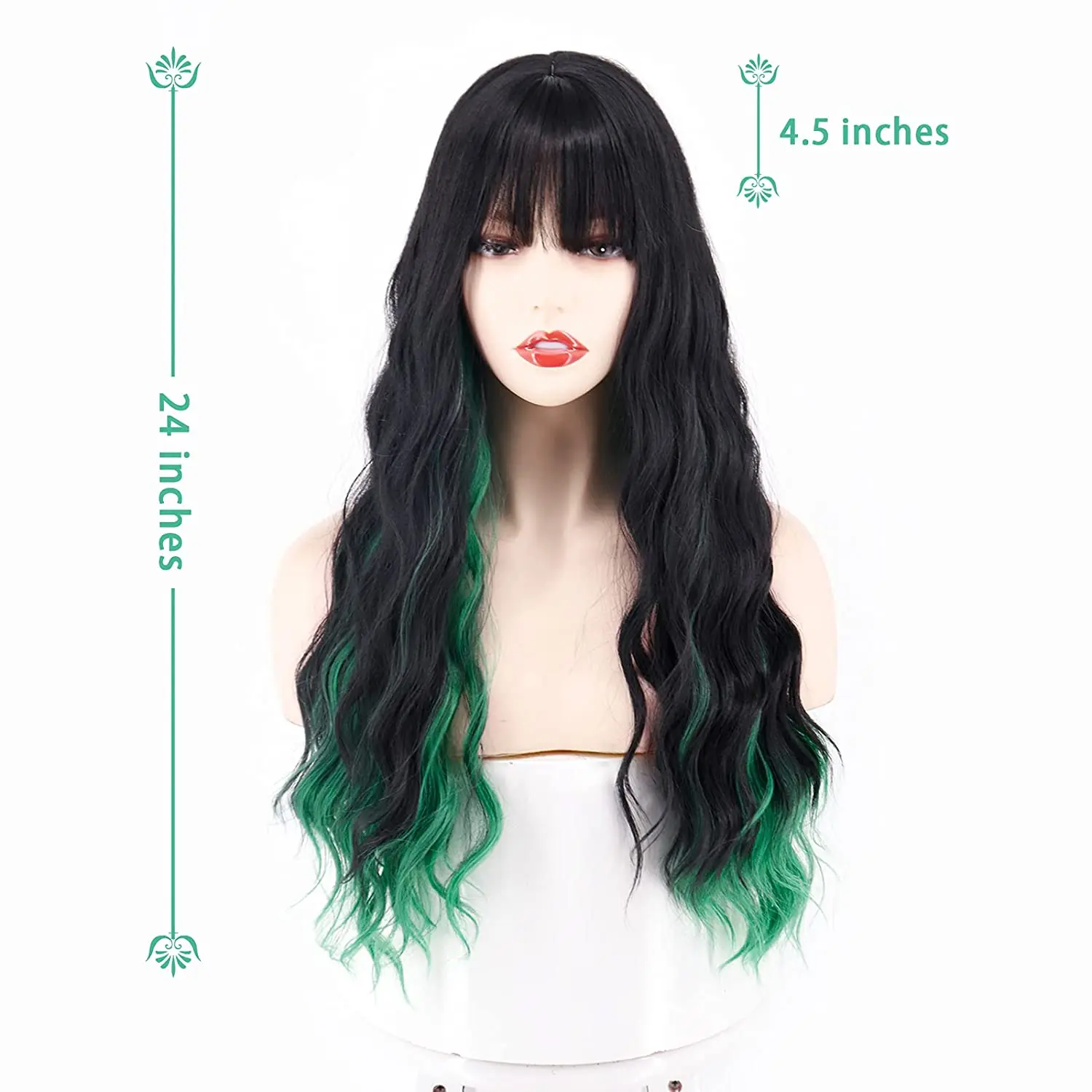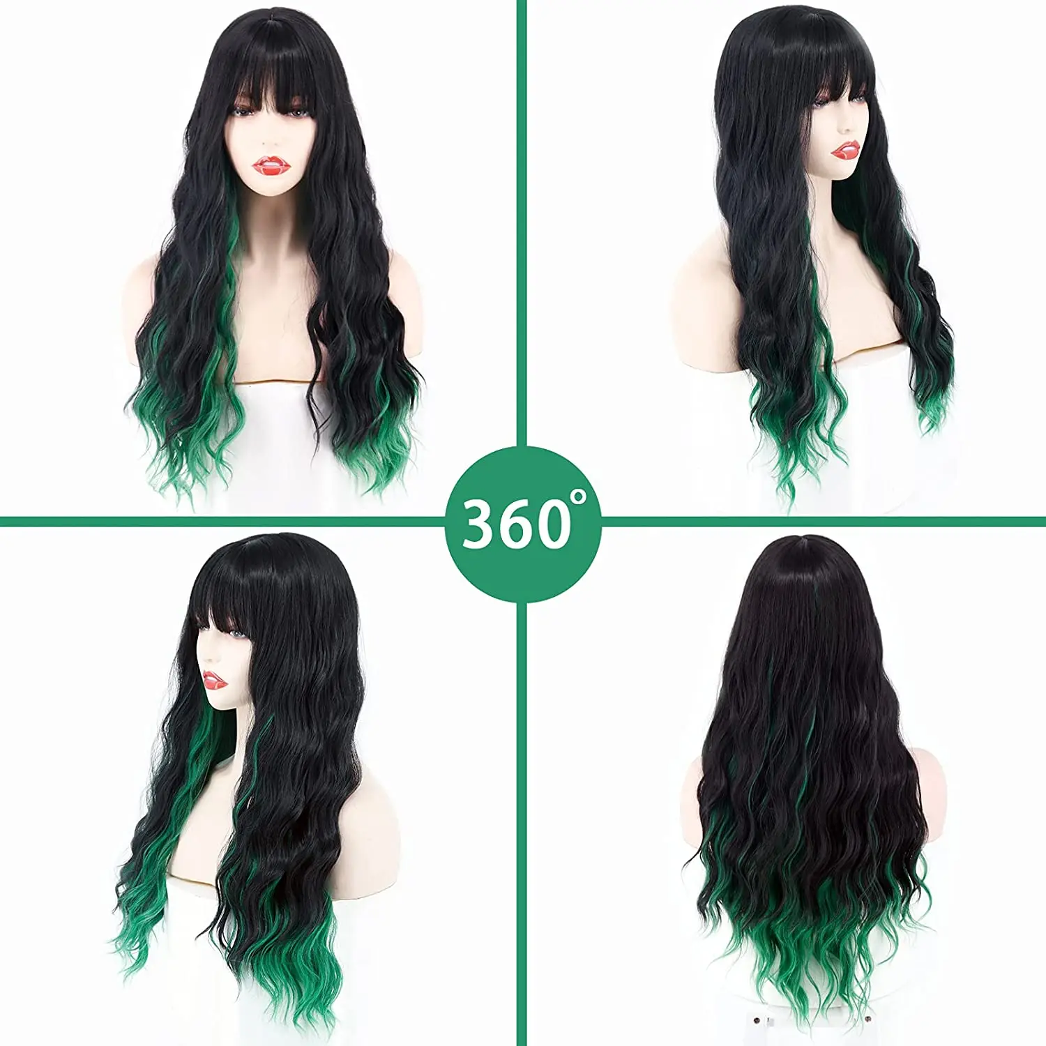 Синтетический длинный волнистый зеленый и черный парик с челкой, длинные парики для женщин, вьющийся волнистый парик, термостойкий для вечеринки, костюма