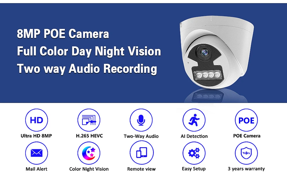 1, Ультра HD 4K дисплей высокой четкости, расширенное H.265 Сжатие видео;2. Ультра HD 4K POE ip-камера, АБС-пластик, подходит для внутреннего и наружного использования, надежная Домашняя безопасность;3. Поддержка питания через Ethernet, подключи и работай, простота установки;4. Поддержка двусторонней аудиозаписи, все камеры встроены в микрофон и динамик;5. Поддержка Full HD дневного ночного видения;6. Поддержка IR-CUT переключателя двойного фильтра, днем и ночью для достижения мониторинга, цвет не является частичным искажением цвета;7. Поддержка обнаружения движения, оповещения по электронной почте, воспроизведения видео и многоязычности;8. Поддержка Android,Iphone,Ipad,PC,VMS,P2P view;9, удаленный доступ в любом месте, в любое время;