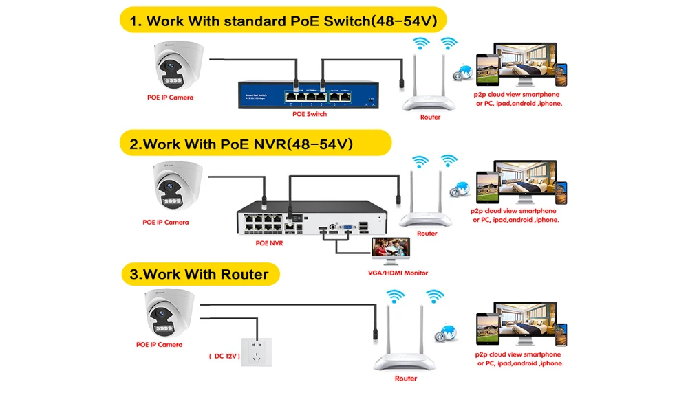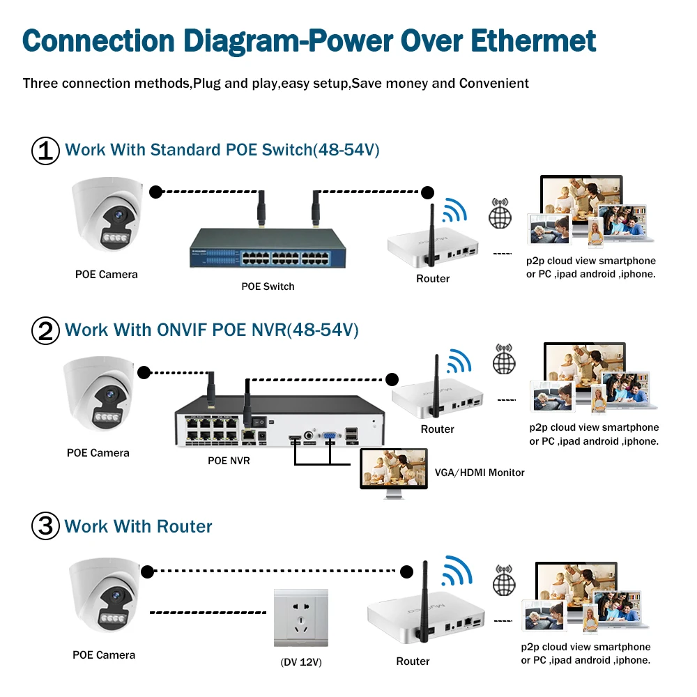 Не нужны дополнительные кабели питания или адаптеры или переключатели. Подключи и работай и простая настройка.Экономьте деньги и удобно, POE NVR = NVR + POE коммутатор.