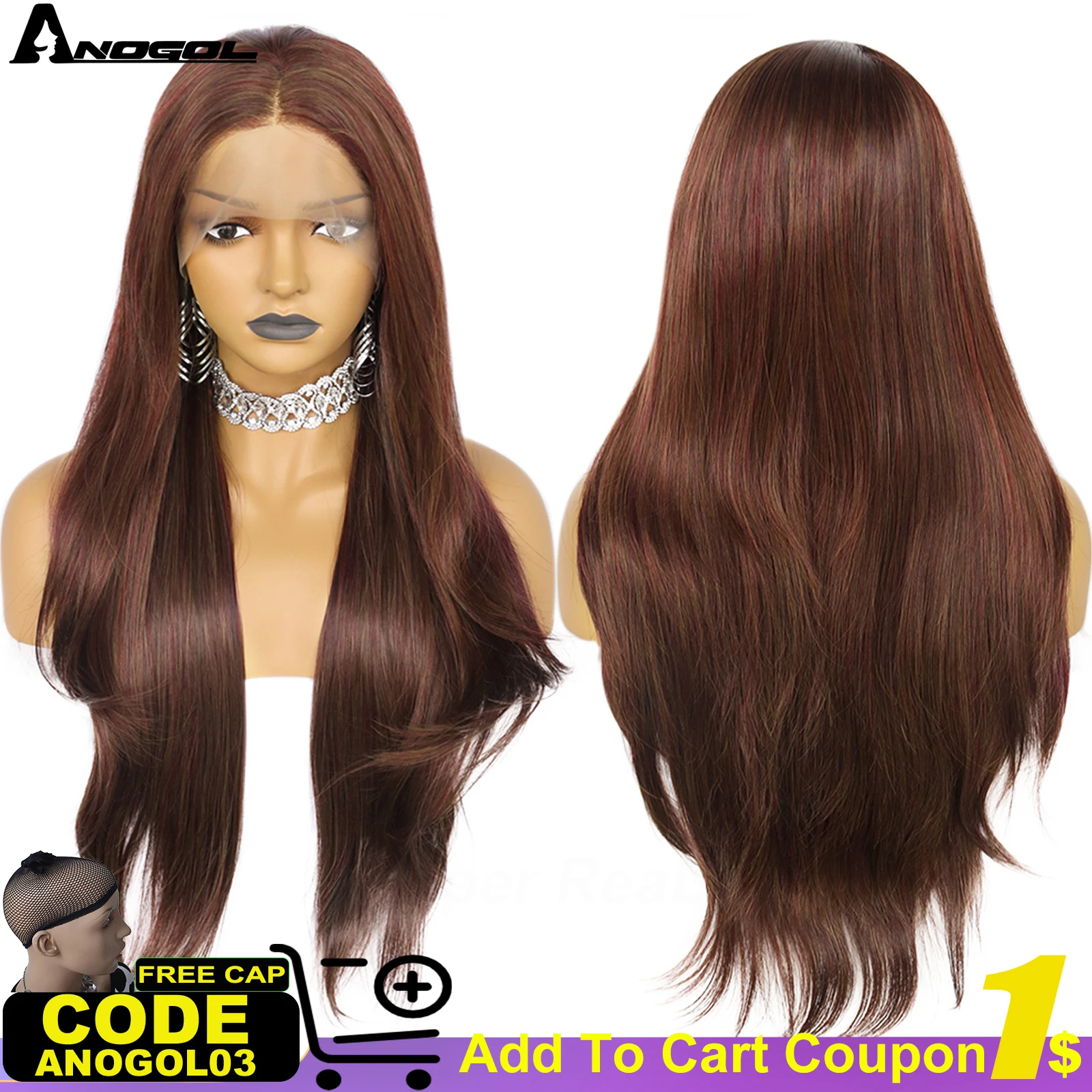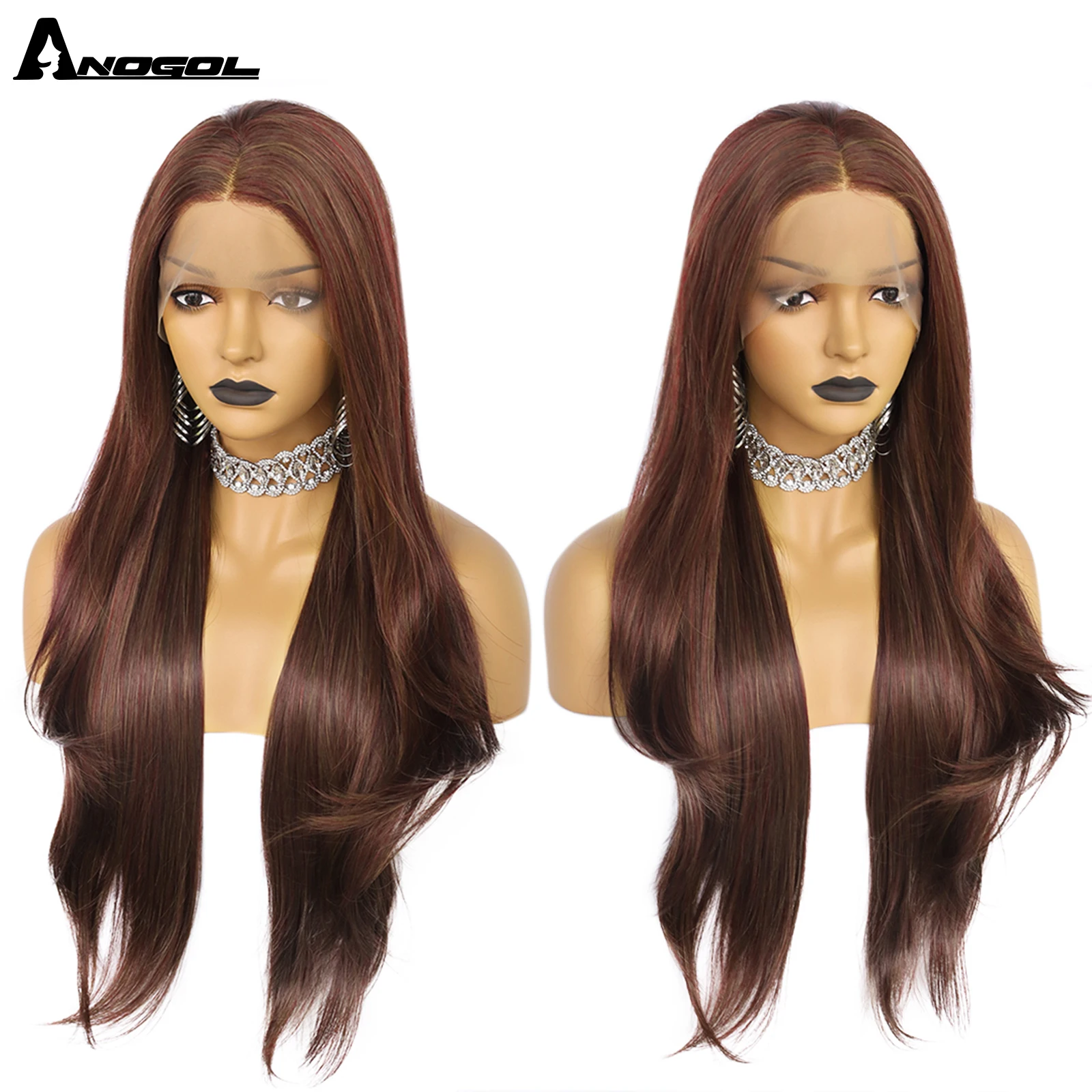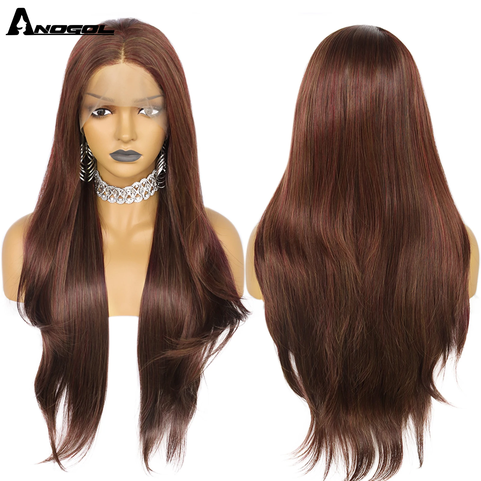 ANOGOL 30 дюймов коричневый 13X 4 синтетические парики для фронта шнурка Длинные гладкие высокотемпературные волоконные волосы свободная часть натуральный волнистый парик для черной женщины