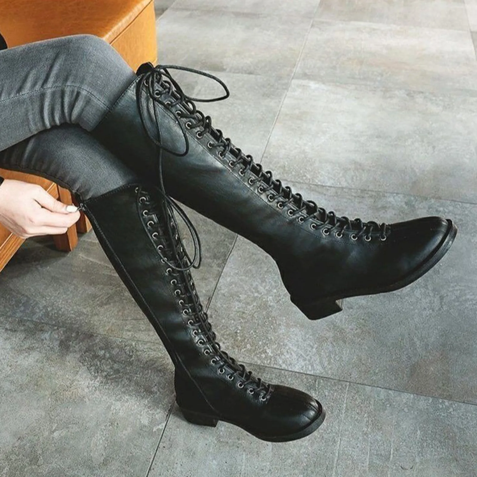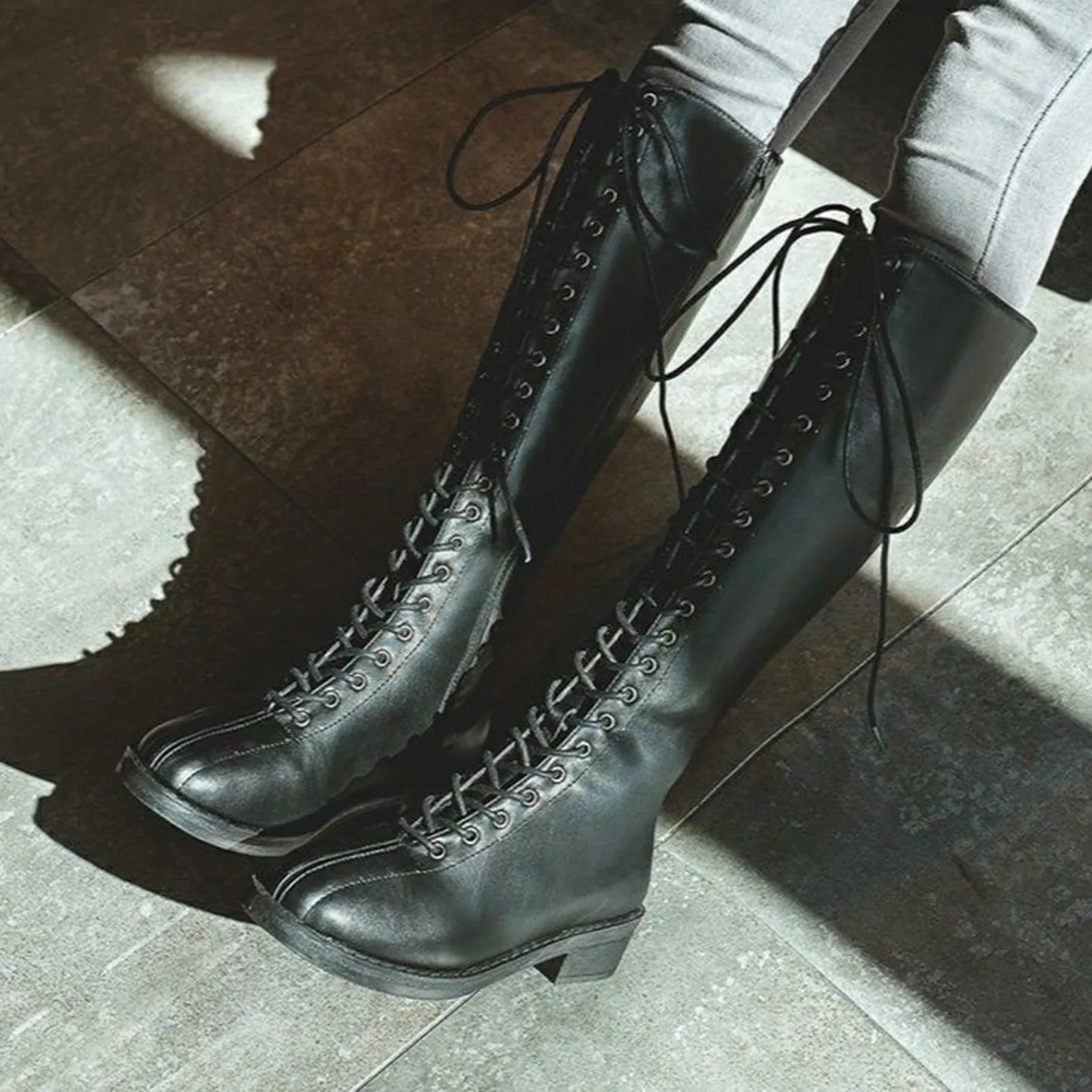 Женские сапоги до колена на шнуровке, из ПУ кожи, на квадратном каблуке, большие размеры до 43