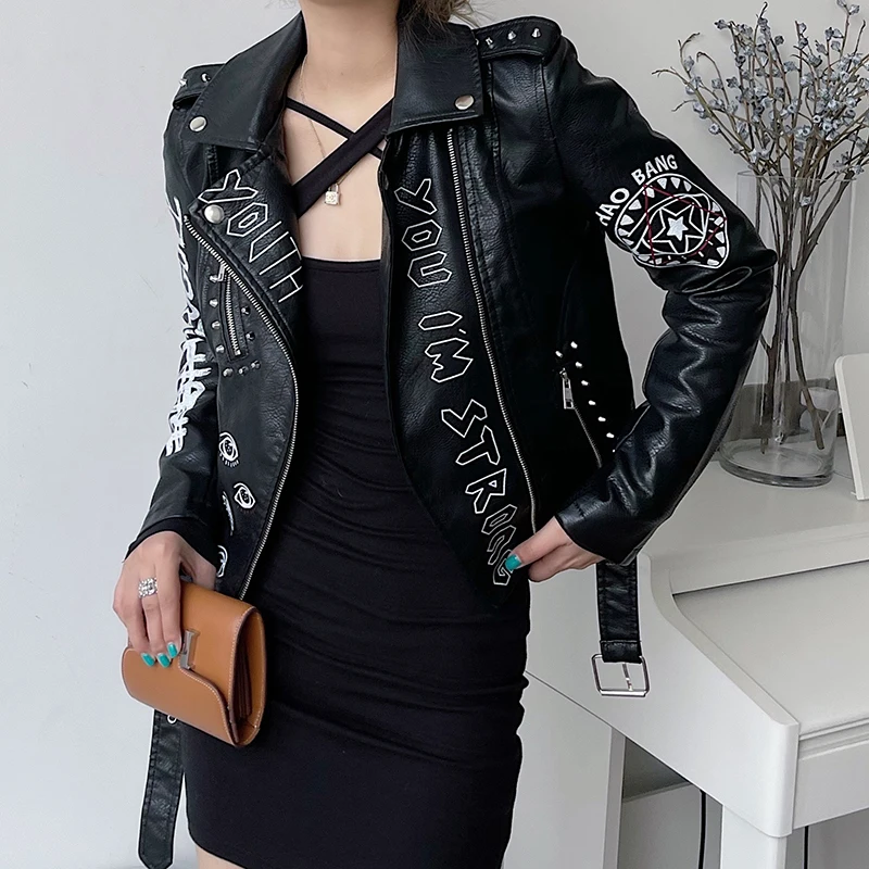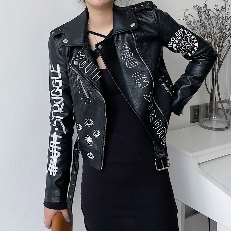 Женская куртка из искусственной кожи LY VAREY LIN, демисезонная короткая куртка из искусственной кожи с принтом граффити, с ремнем и заклепками